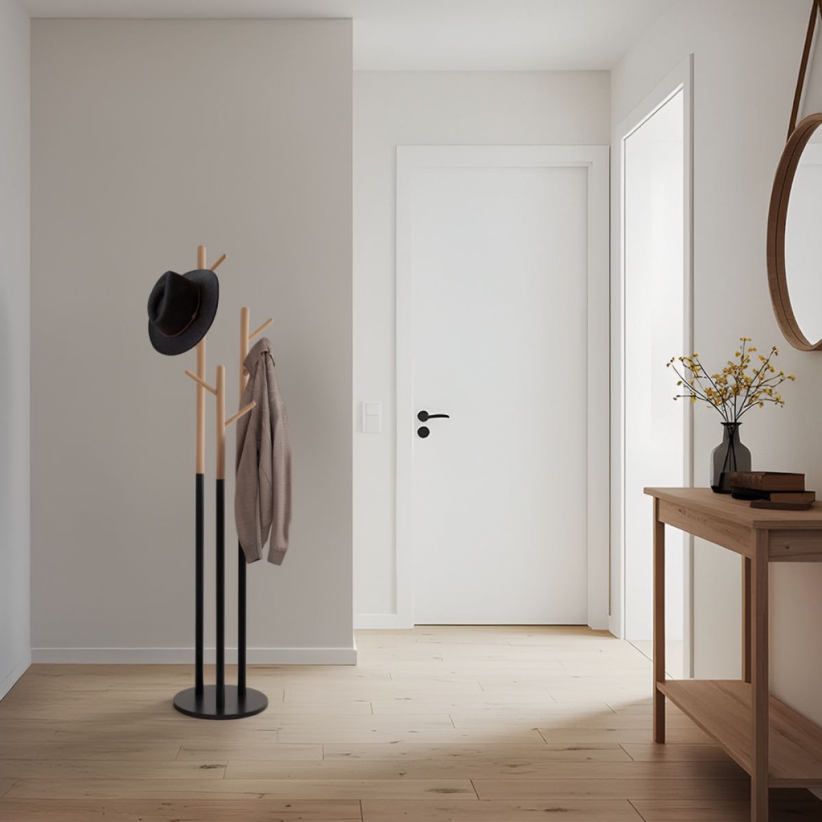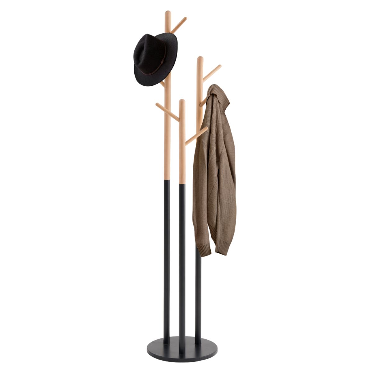 Material: metal/lemn Culoare: neagră/naturală Dimensiuni (Dxh): 36x171 cm Diametru bază: 36 cm Cu cârlige Portanţă cârlig: 2,5 kg Simplu Practic Livrat dezasamblat