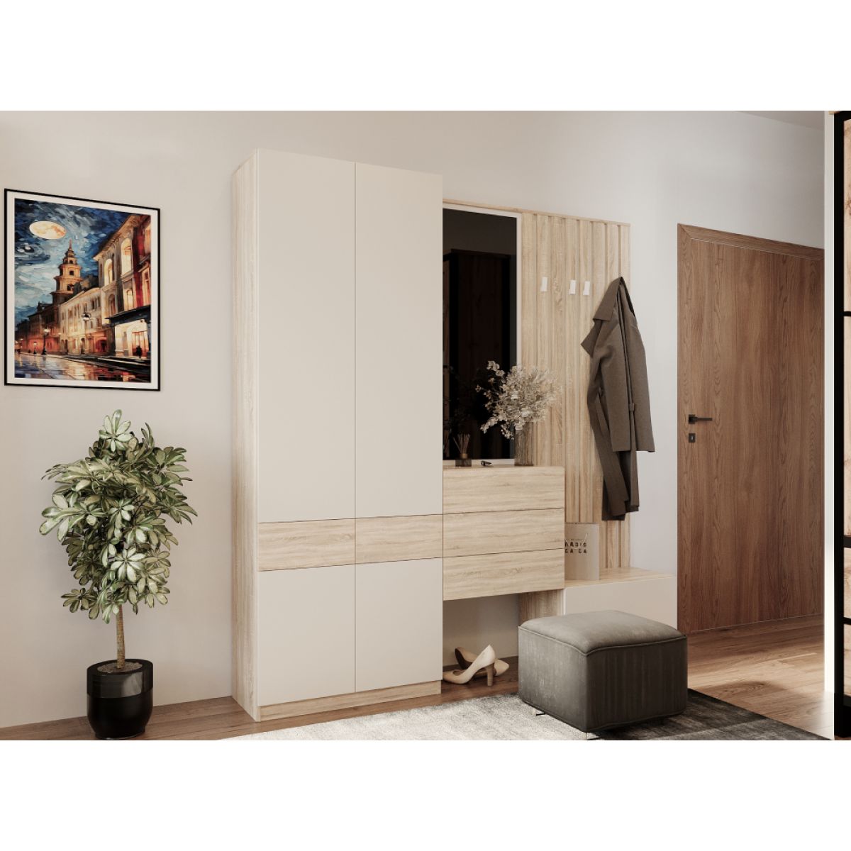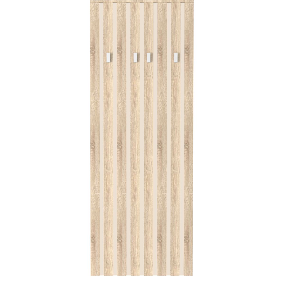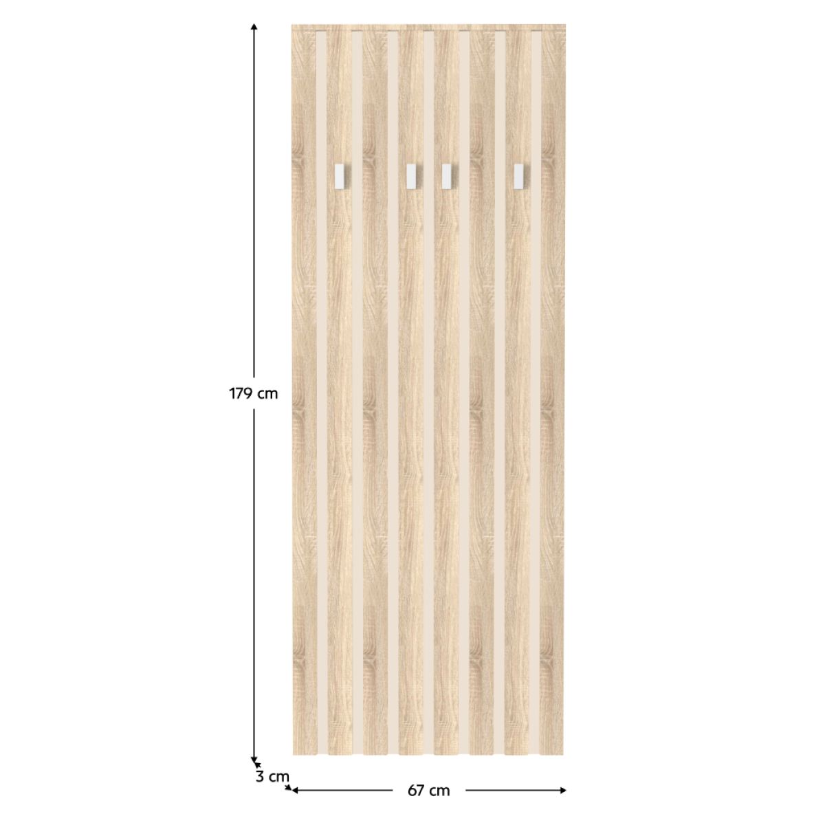 Material: DTD laminat Culoare: stejar sonoma/caşmir Dimensiuni (lxAxh): 67x3x179 cm Grosime material DTD: 1,6-2,2 cm Patru cârlige Culoarea cârligului: argintiu Material cârlig: plastic Lamele decorative Design modern Vă recomandăm să ataşaţi pe perete Livrat dezasamblat