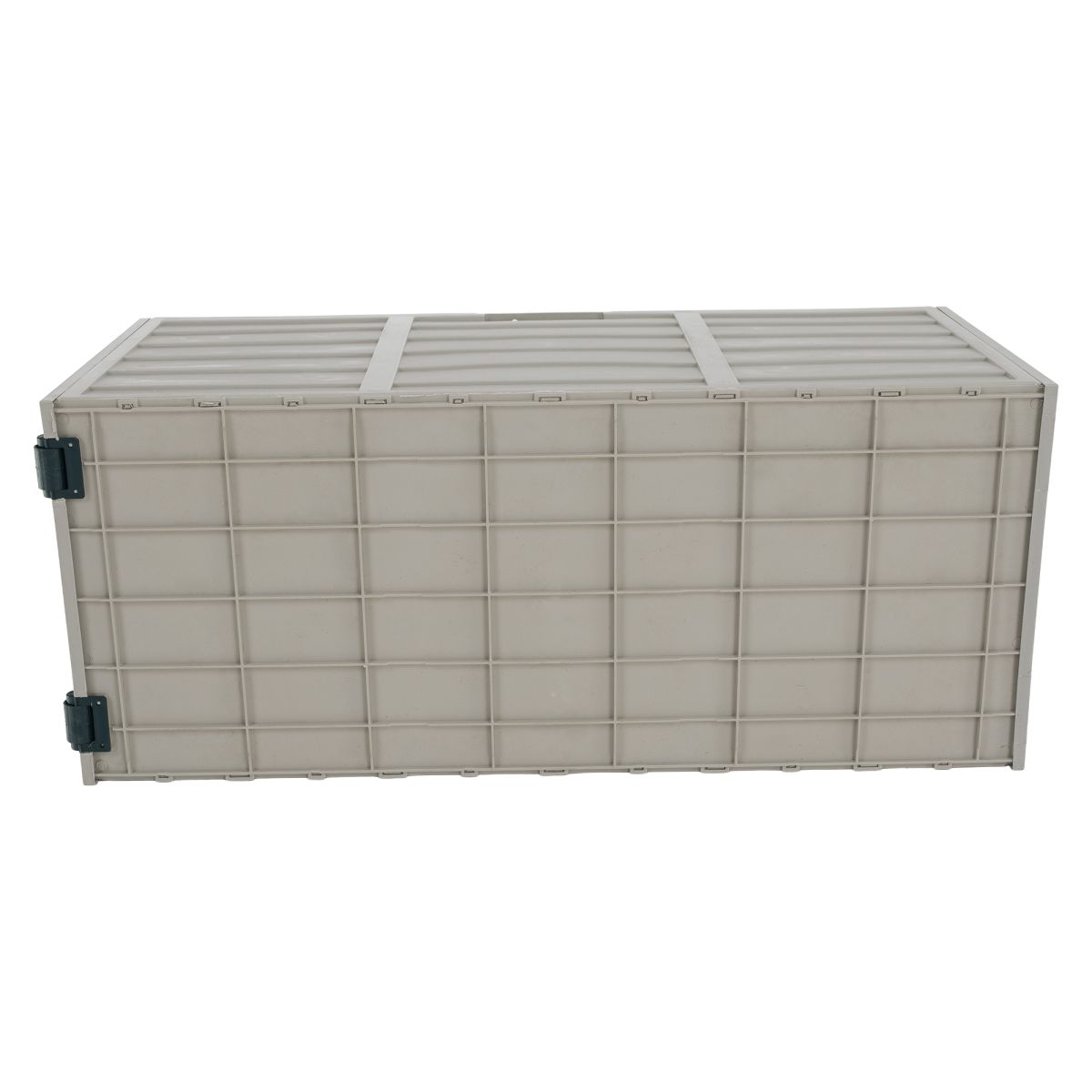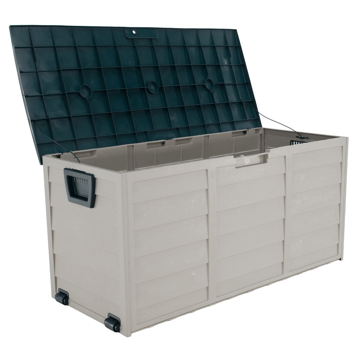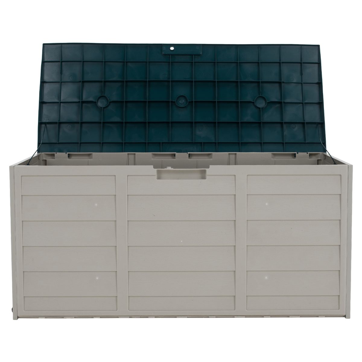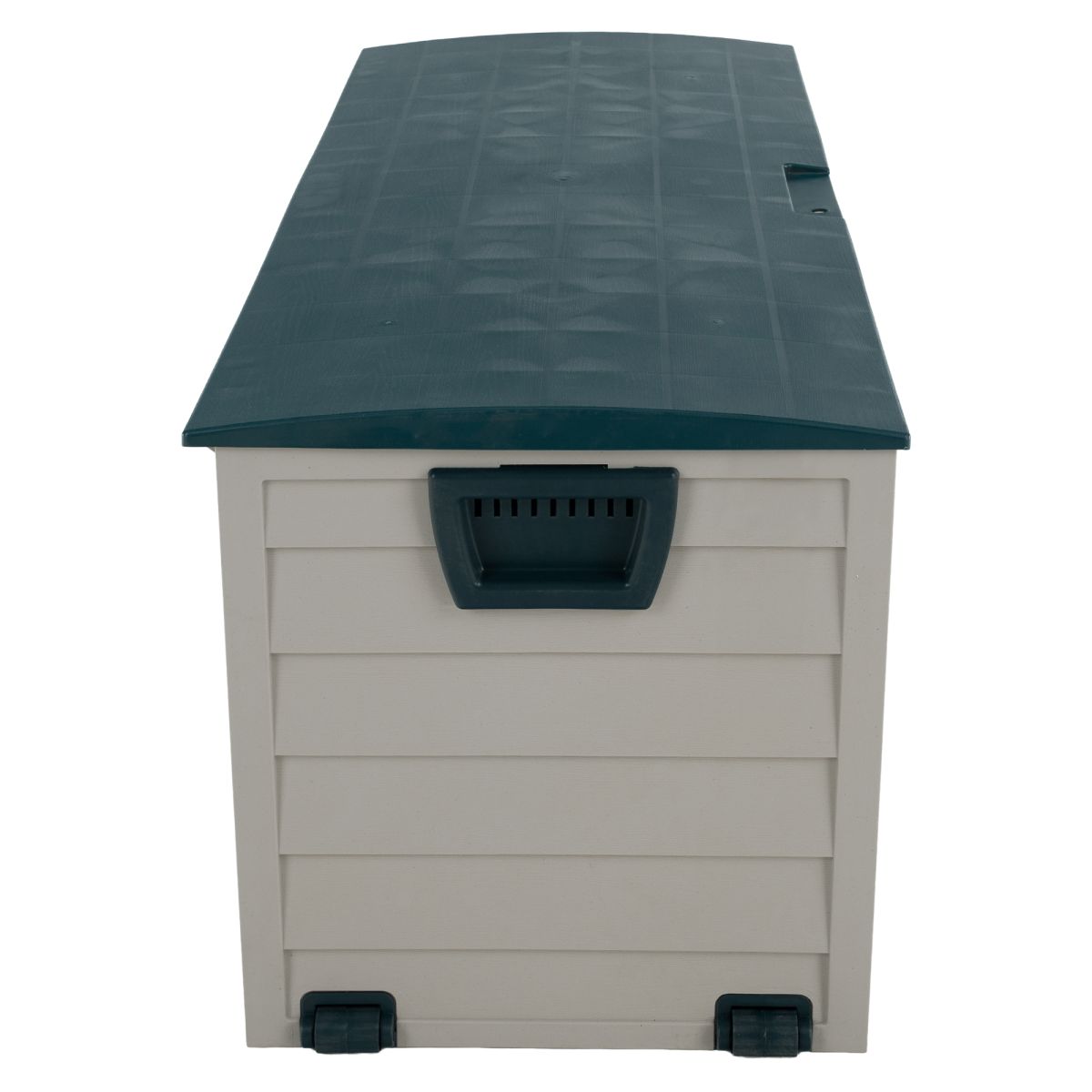 Material: plastic Culoare: gri/verde Dimensiuni (lxAxh): 112x49x54 cm Volum: 300 l Grosime material: 2,5 mm Portanţă: max. 125 kg Greutate: 7,4 kg Mânere încastrate Ro?i practice pe o parte a cutiei Capac cu balamale Dispozitiv de închidere cu lacăt atârnat Încuietoarea nu este inclusă în livrare Potrivit pentru exterior Rezistent la condiţii climaterice Rezistent la radiaţiile UV Vă recomandăm să protejaţi produsul de intemperii pentru a prelungi durata de viaţă a produsului Livrat dezasamblat