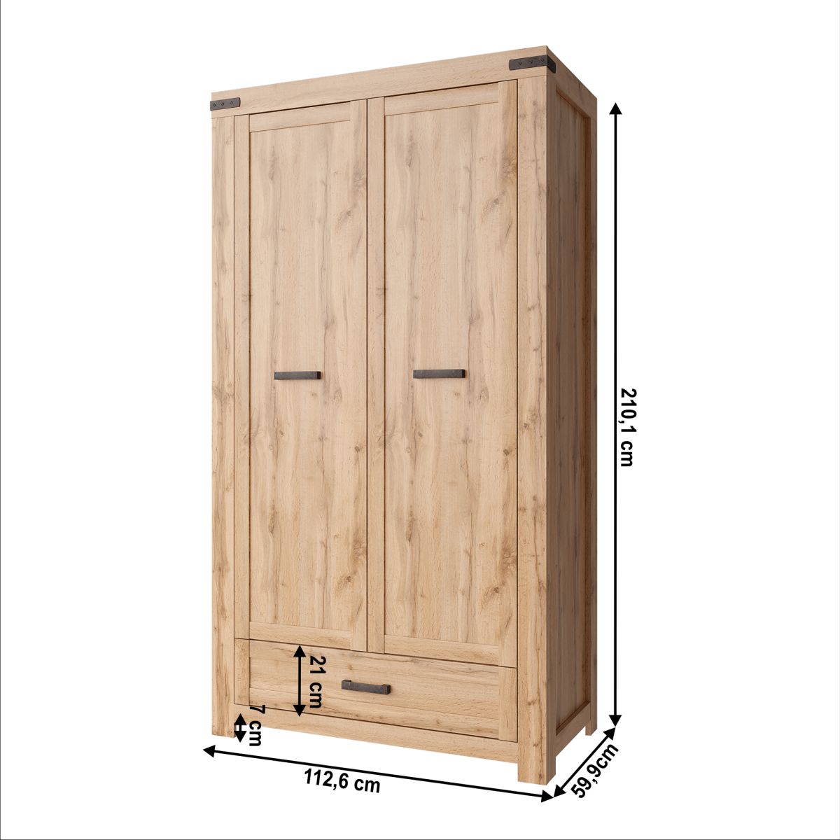 "Material: DTD laminat/MDF/plastic Culoare: stejar wotan Dimensiuni (LxlxÎ): 112,6x59,9x210,1 cm Înălţimea picioarelor este de 7 cm Grosimea materialului: 1,6 - 2,2 cm Combinat Cu două uşi Un dulap Există o tijă de cuier şi un raft în dulap Un sertar Înălţime sertare: 21 cm Decor şi mânere din plastic Uşă din MDF Livrat dezasamblat"
