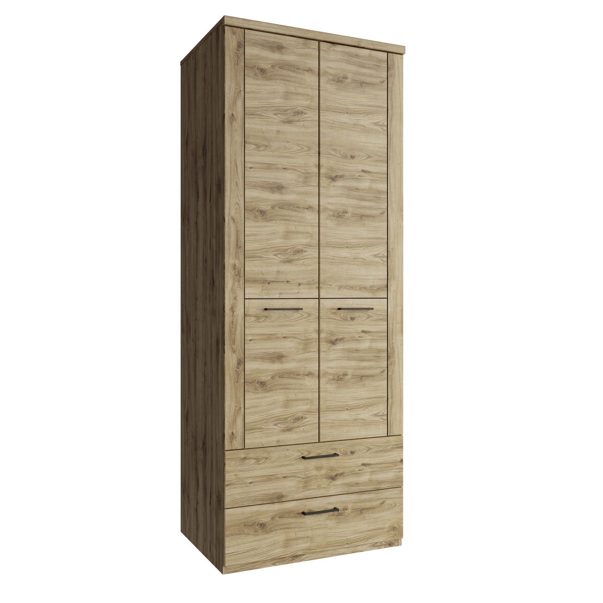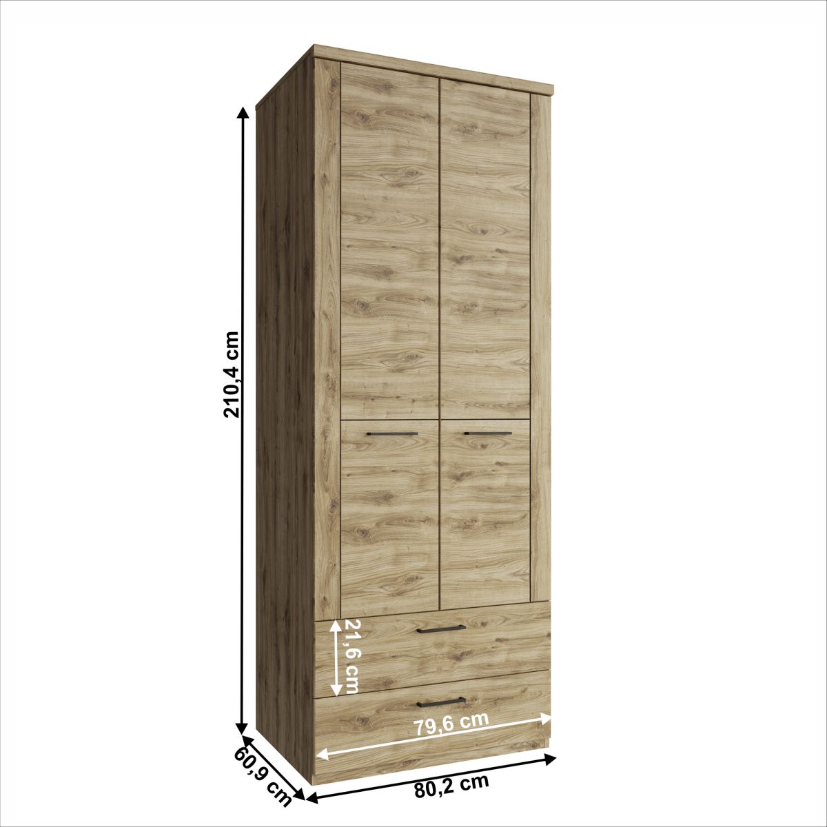 "Dulap DORSI 2D2S Material: DTD laminat/MDF Culoarea: stejar navarra Dimensiuni (LxAxÎ): 80,2x60,9x210,4 cm Grosimea materialului: 1,6 cm Cu două uşi Un dulap În dulap există o tijă pentru umeraşe şi un raft. Capacitatea de încărcare a raftului şi a tije pentru umeraşe: 10 kg Două sertare Dimensiuni sertar (LxÎ):79,6x21,6 cm Capacitatea de încărcare a sertarelor: 5 kg Mânere din plastic Culoarea mânerului: neagră Design modern Livrat în formă dezasamblată"