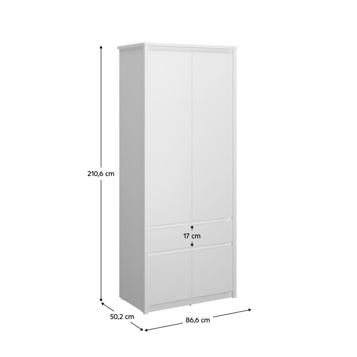 Material: PAL melaminat / muchii din ABS Culoare: albă Dimensiuni (LxAxÎ): 86,6x50,2x210,6 cm Grosimea materialului: 1,6-3,2 cm Cu patru uşi Cu spaţiu de depozitare Cu bară pentru umeraşe Capacitatea de încărcare a barei pentru umeraşe: 15 kg Sertar Înălţime sertar: 17 cm Picioare din plastic Design modern Vă recomandăm să ataşaţi mobilierul de perete Livrată dezasamblată