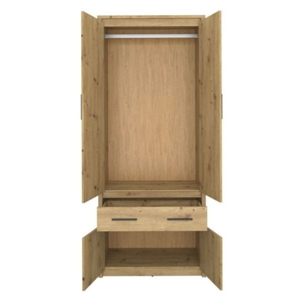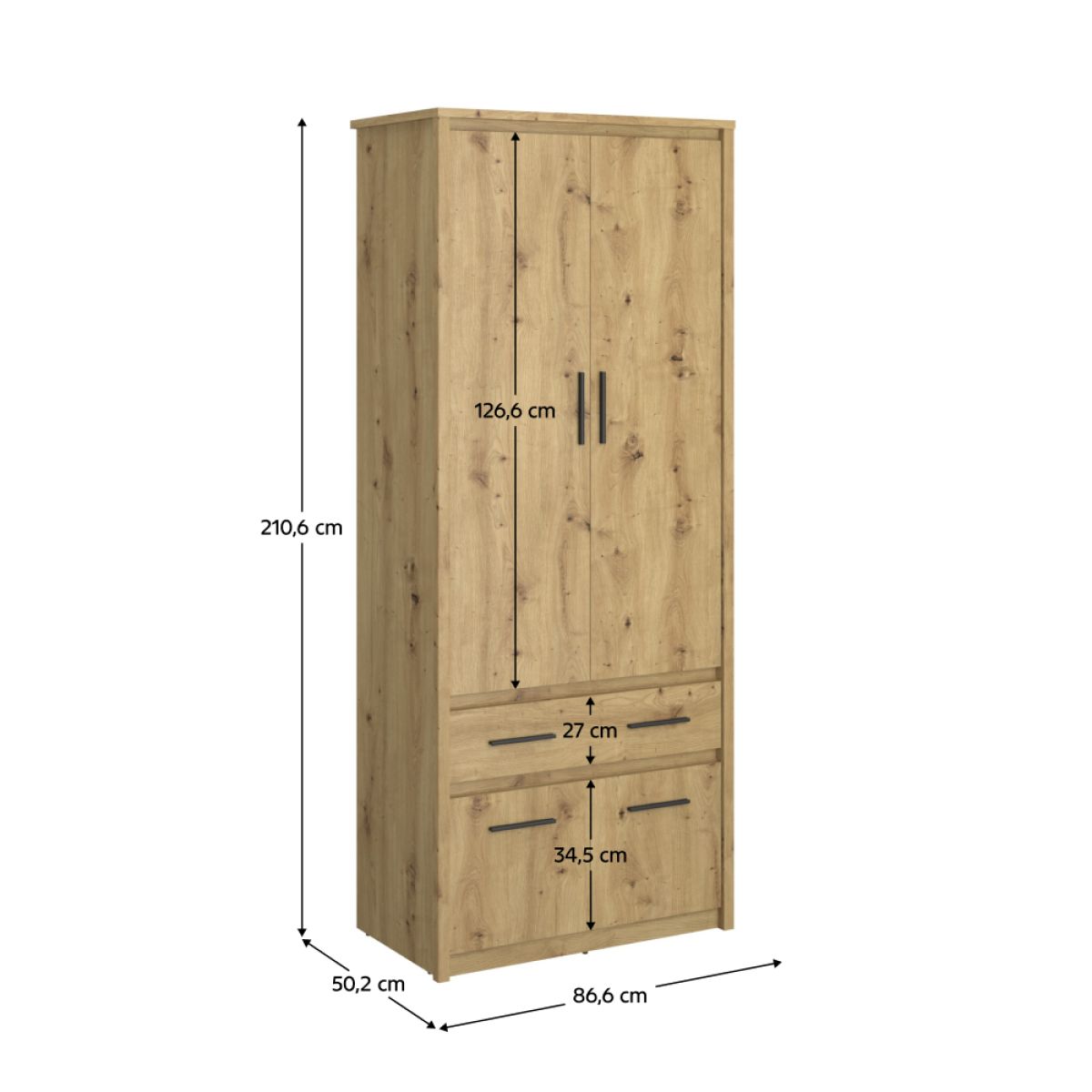 Material: PAL melaminat / margini ABS Culoare: stejar Artisan Dimensiuni (LxAxÎ): 86,6x50,2x210,6 cm Grosimea materialului: 1,6-3,2 cm Mânere din plastic Culoarea mânerelor: neagră Cu patru uşi Spaţiu de depozitare Sertar Înălţime sertar: 27 cm Bară pentru umeraşe Capacitatea de încărcare a barei pentru umeraşe: 15 kg Picioare din plastic Vă recomandăm să ataşaţi mobilierul de perete Design modern Livrat dezasamblat