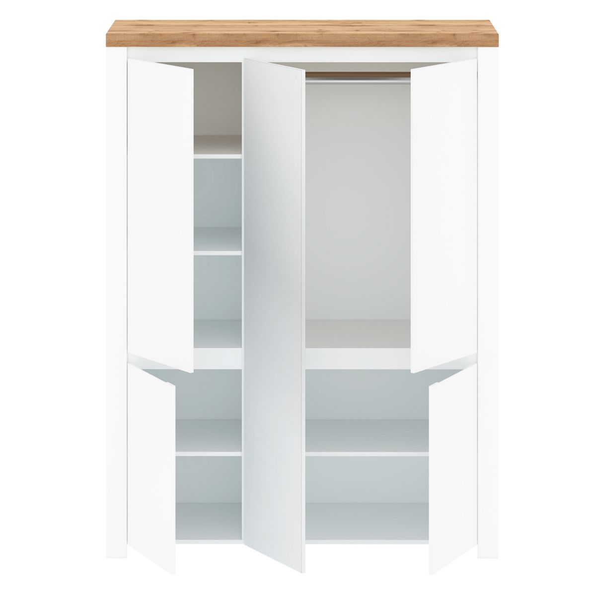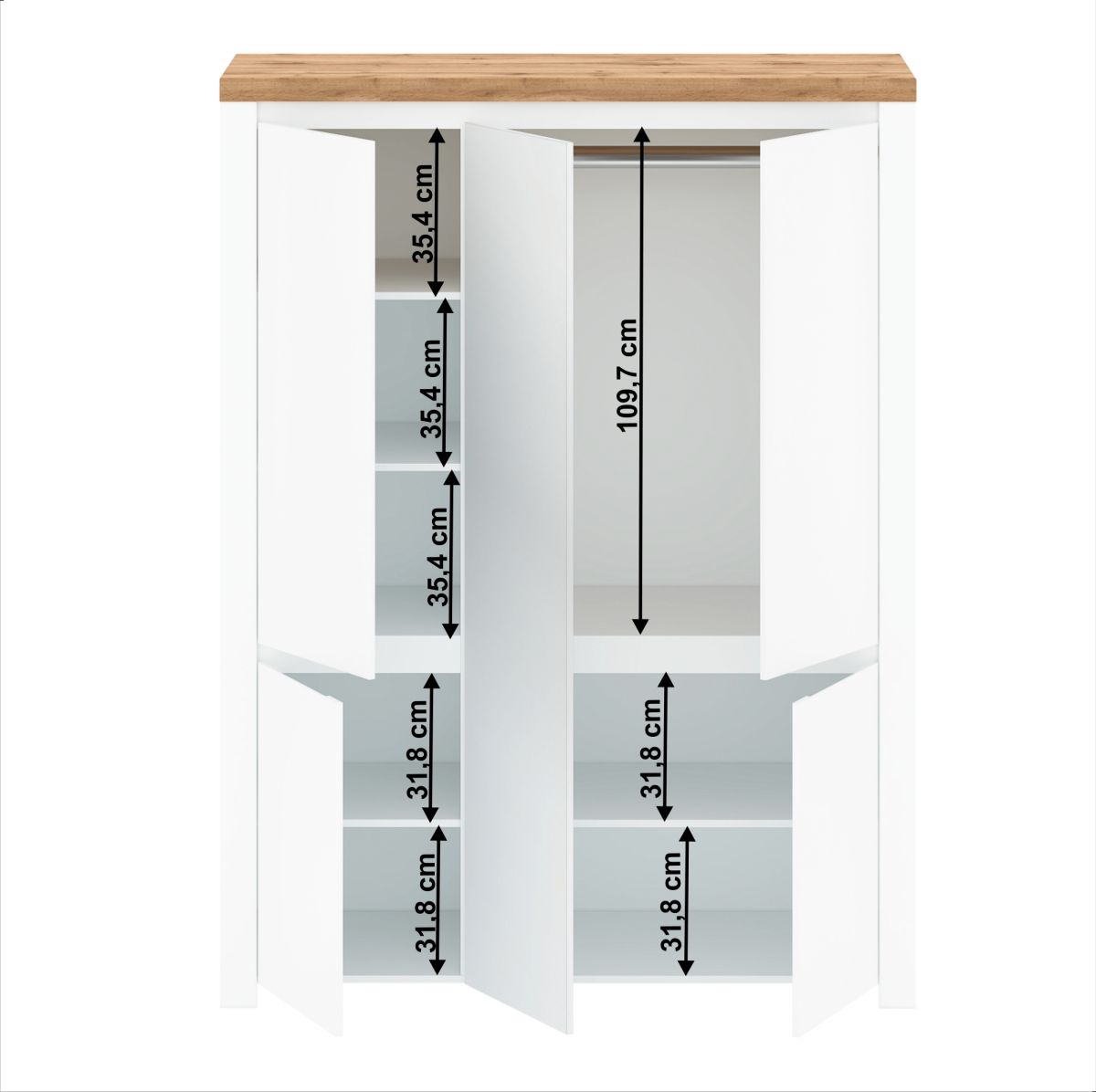 Material: DTD laminat/ canturi ABS/ MDF Culoare: alb foarte lucios/ stejar wotan Dimensiuni (LxAxÎ): 150,8x56x202 cm Grosimea materialului: 1,6 până la 2,2 cm Înălţimea spaţiului inferior de la podea: 5 cm 5 uşi 4 rafturi, 1 tijă de cuier, 1 oglindă Există rafturi în dulapuri Înălţimea rafurilor superioare mai mici: 35,4 cm Înălţimea raftului mare superior: 109,7 cm Înălţime rafturi inferioare: 31,8 cm O mulţime de spaţiu de depozitare Deschidere/închidere cu o decupare Fără mânere Uşă din MDF Livrat dezasamblat