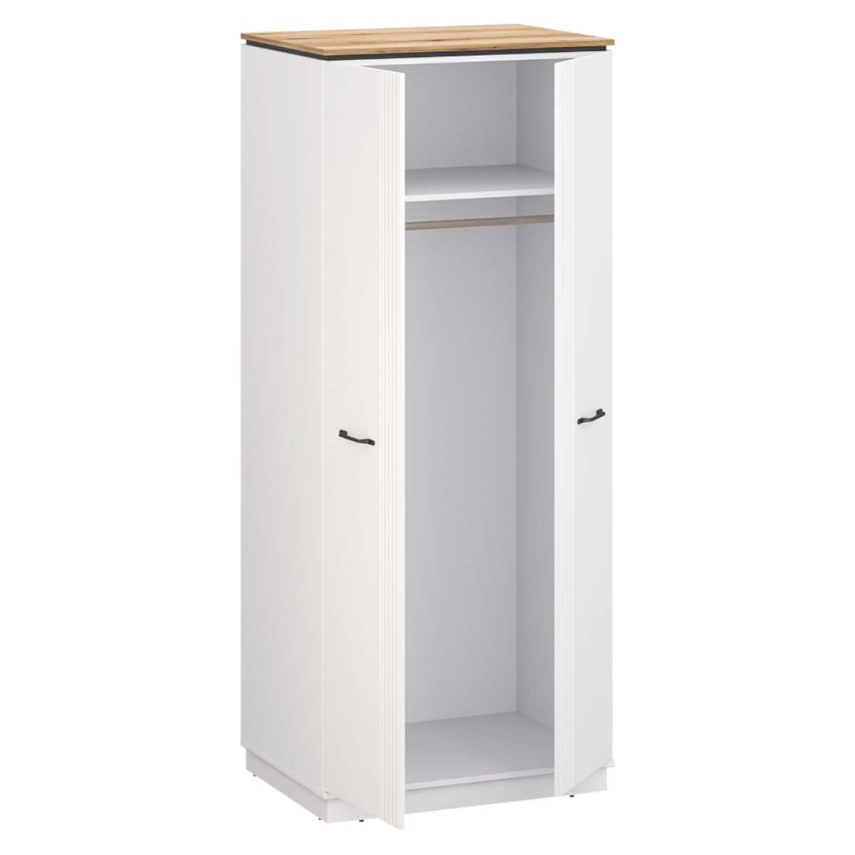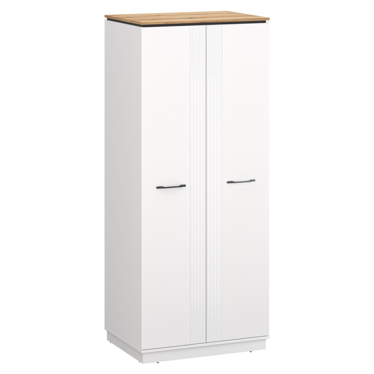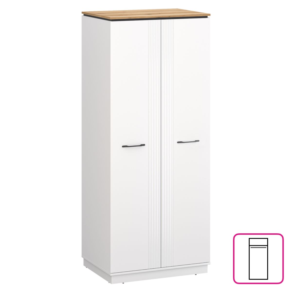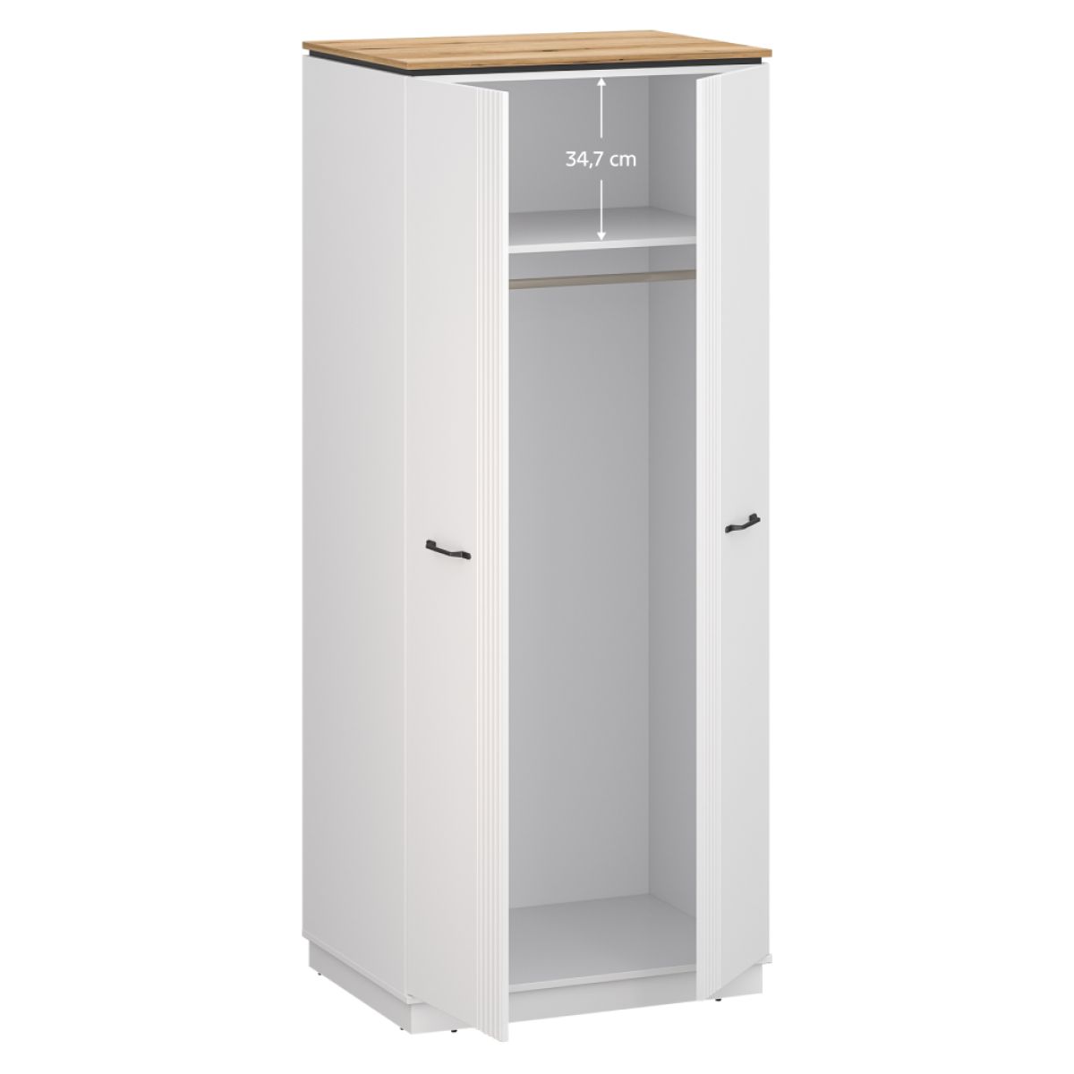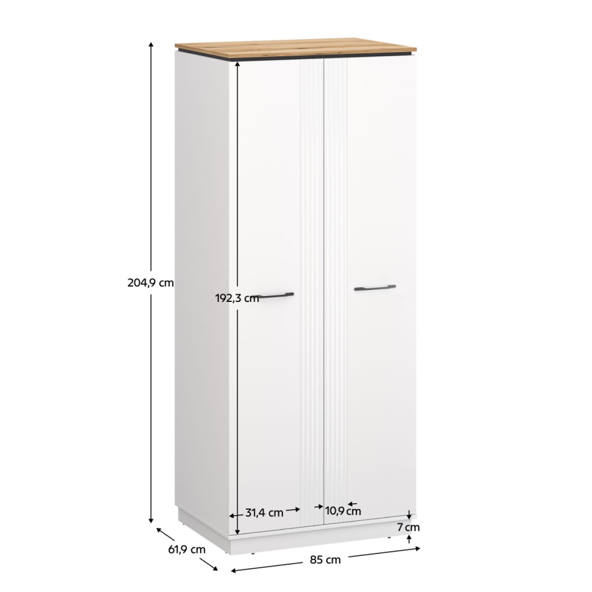 Material: DTD laminat/MDF înfoliat/PVC Culoare: alb/stejar evoke Dimensiuni (lxAxh): 85x61,9x204,9 cm Grosimea materialului: 1,6 cm Cu două uşi Cu oglindă Poliţă Bară de haine Mânere metalice Culoare mâner: negru Uşă decorativă cu caneluri Design modern Recomandăm fixarea pe perete Livrată dezasamblată