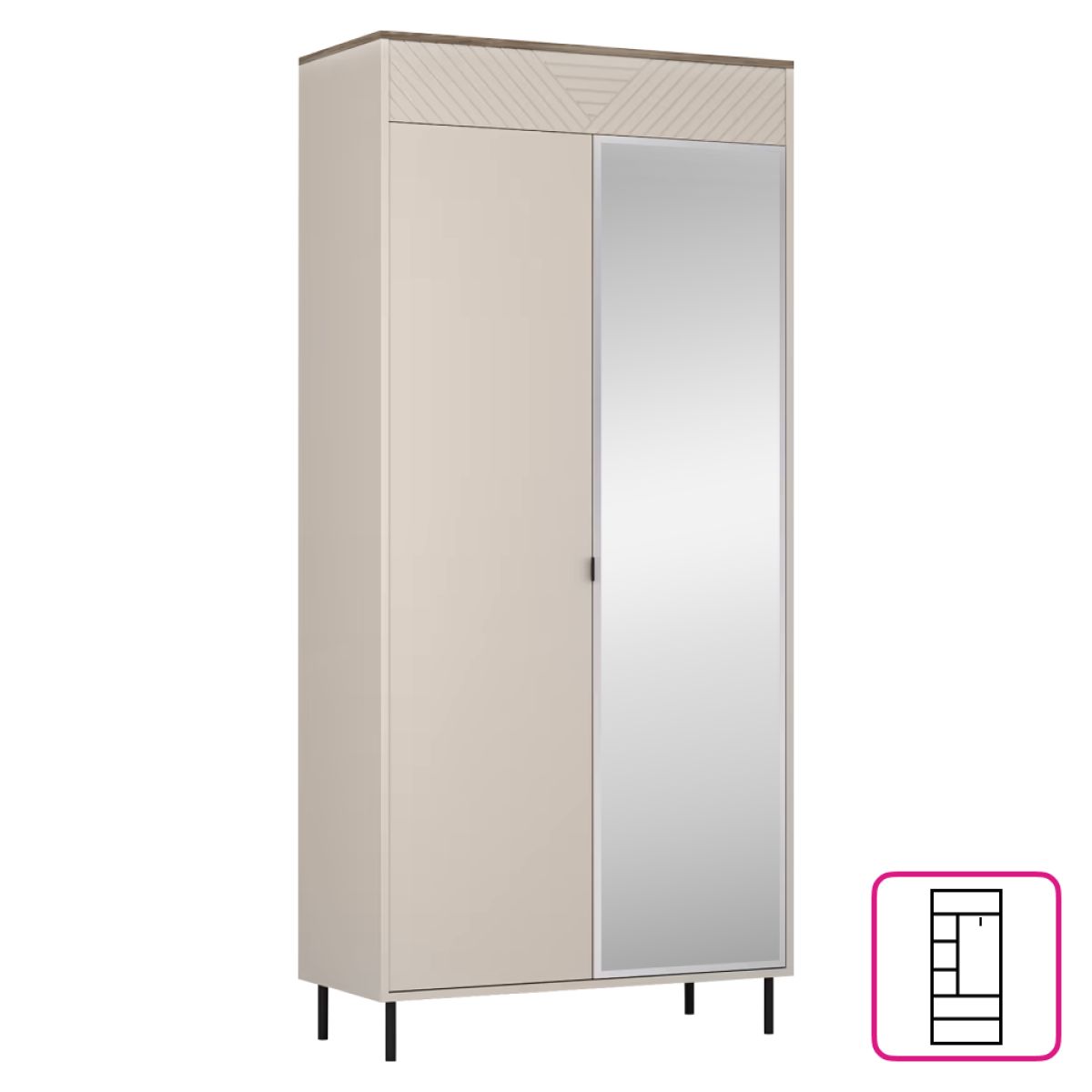 Material: DTD laminat/MDF înfoliat/margini ABS/sticlă Culoare: caşmir/stejar castello Dimensiuni (lxAxh): 90x40x194 cm Grosime material: 1,6 cm Cu oglindă Cu două uşi Bară pentru umeraşe extensibilă Cu poliţe Cu mânere Materialul mânerelor: metal Culoarea mânerelor: neagră Cu picioare Materialul piciorului: metal Culoarea picioarelor: neagră Înălţimea picioarelor: 12 cm Portanţa barei pentru umeraşe: 5 kg Portanţa poliţei: 5 kg Uşi decorative Design modern Vă recomandăm fixarea mobilierului de perete Livrat dezasamblat