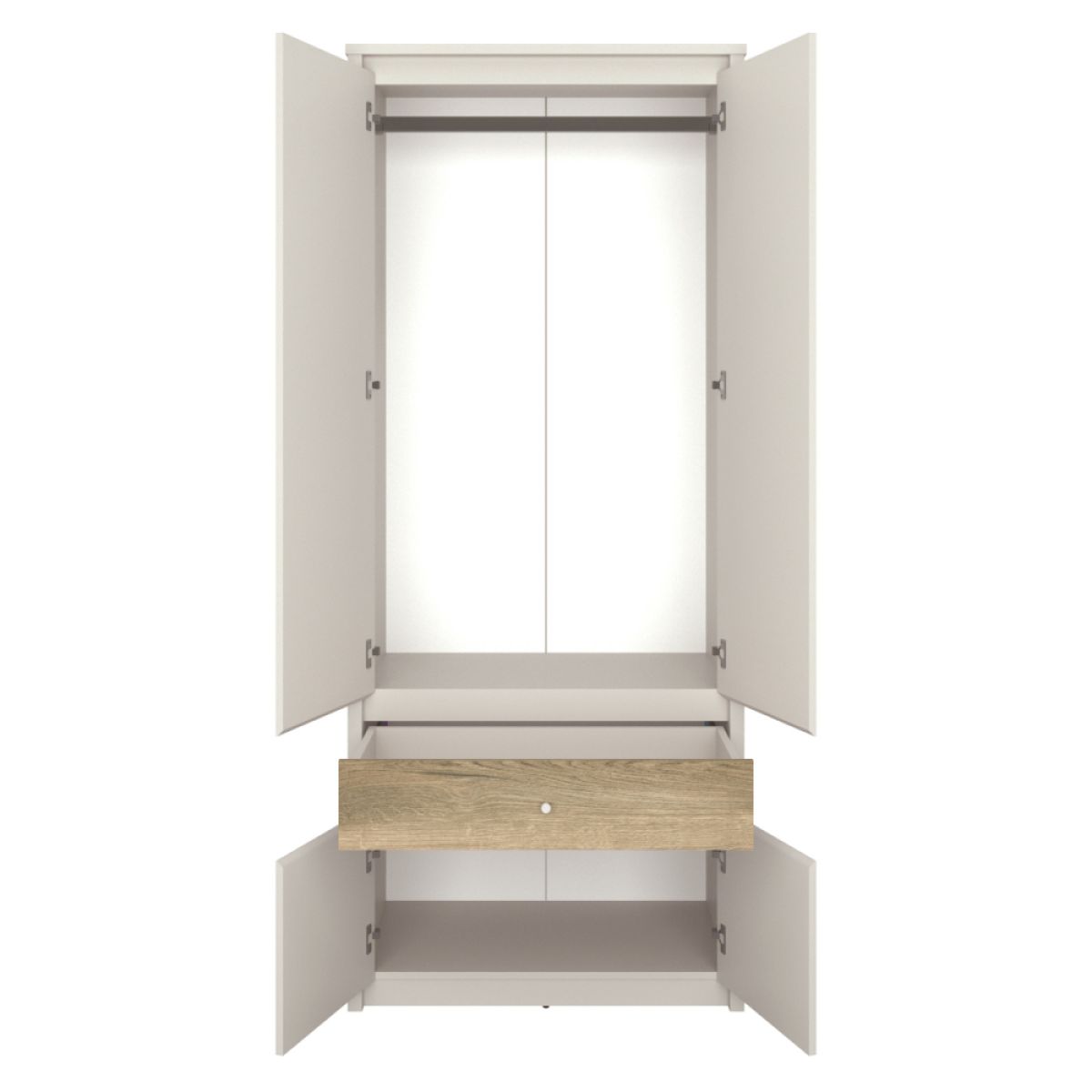 Material: DTD laminat Culoare: caşmir/stejar evoke Dimensiuni (lxAxh): 87x50,5x210,5 cm Grosimea materialului DTD: 1,6-3,2 cm Cu patru uşi Bară de umeraşe Portanţă bară de umeraşe: 5 kg Sertar Cu mâner Material mâner: plastic Culoare mâner: caşmir Portanţă sertar: 3 kg Dulap Fără mâner Crestătură oblică Culoarea plăcii fibrolemnoase: alb Glisoare Înălţimea glisoarelor: 0,3 cm Design modern Vă recomandăm să ataşaţi mobilierul de perete Livrat dezasamblat