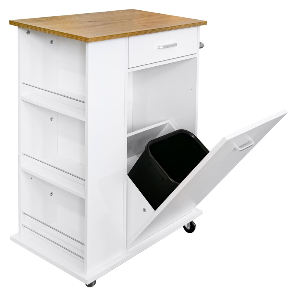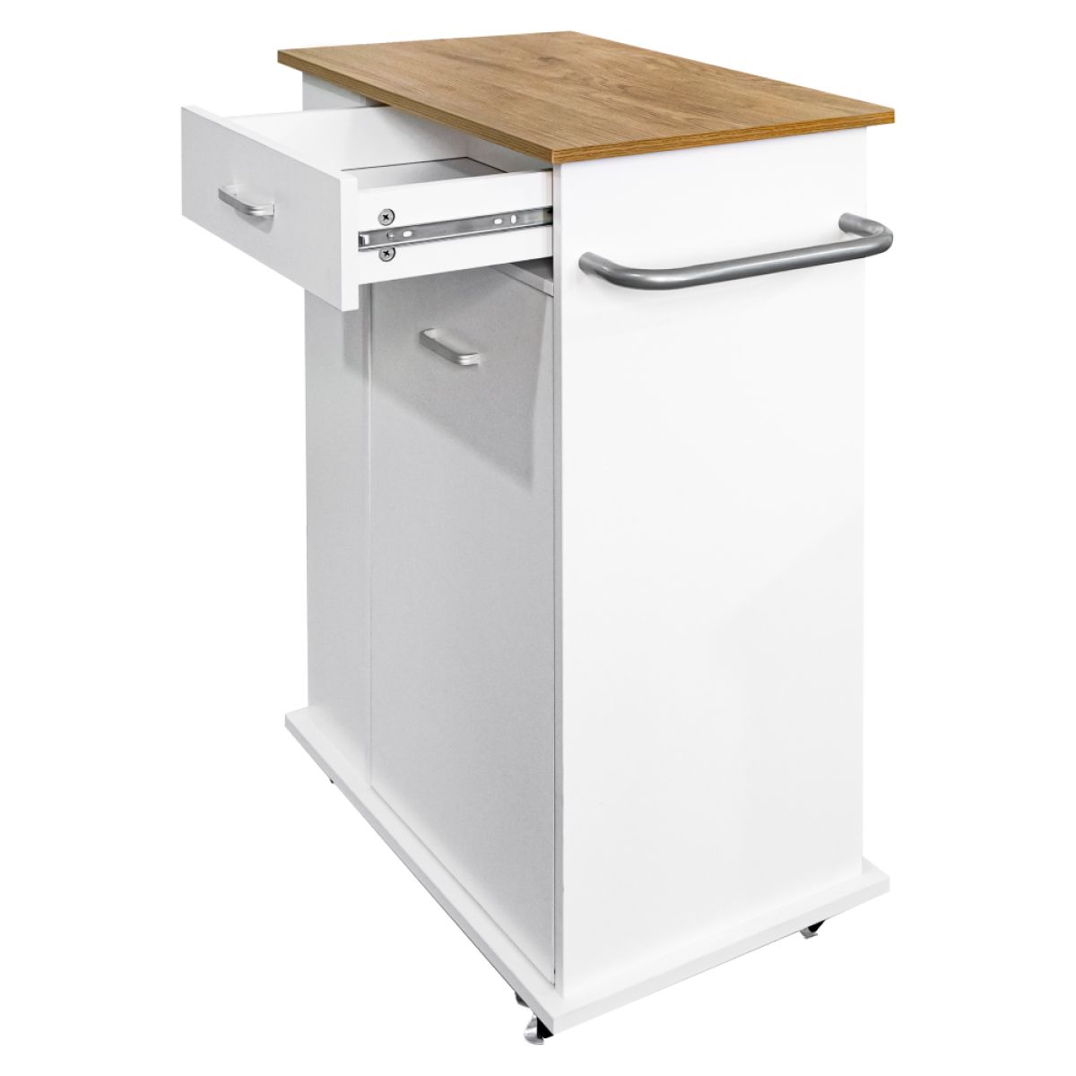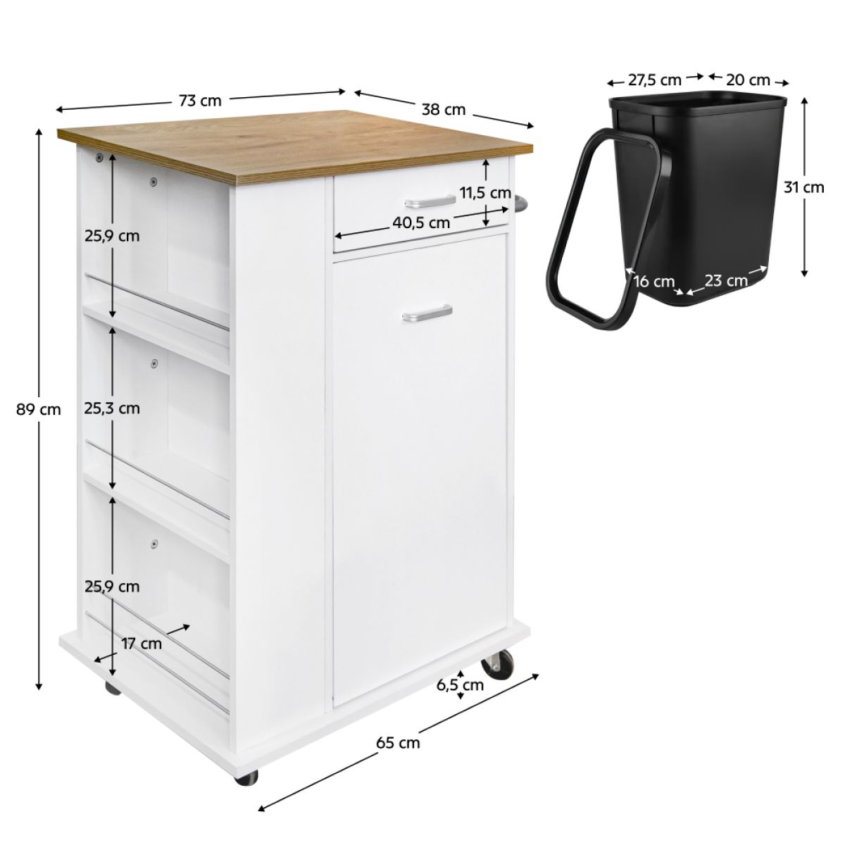 Material: MDF înfoliat Culoare: alb/stejar Dimensiuni (lxAxh): 73x38x89 cm Grosime material: 1,2-1,5 kg Sertar Dimensiuni sertar (lxh): 40,5x11,5 cm Dimensiunile interioare ale sertarului (lxAxh): 36,5x28,7x6,6 cm 3 poliţe laterale Apărători pe poliţe Suport metalic Uşă cu deschidere batantă Livrat cu coş de gunoi Coş de gunoi detaşabil Dimensiuni coş (lxAxh): 27,5x20x31 cm Volumul coşului: 14 l Inel pentru ataşarea sacului Pe roţi Roţi cu frâne Înălţimea roţilor: 6,5 cm Mânere argintii Material mâner: metal Ideal pentru bucătărie, birou sau cameră tehnică. Multifuncţional Portanţă: 20 kg Livrat dezasamblat