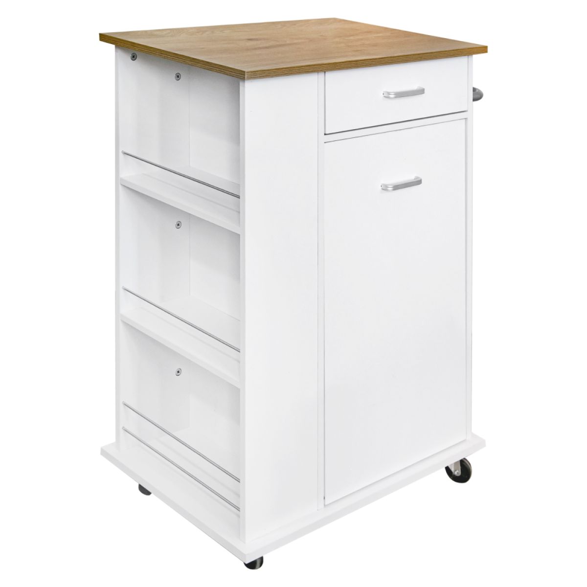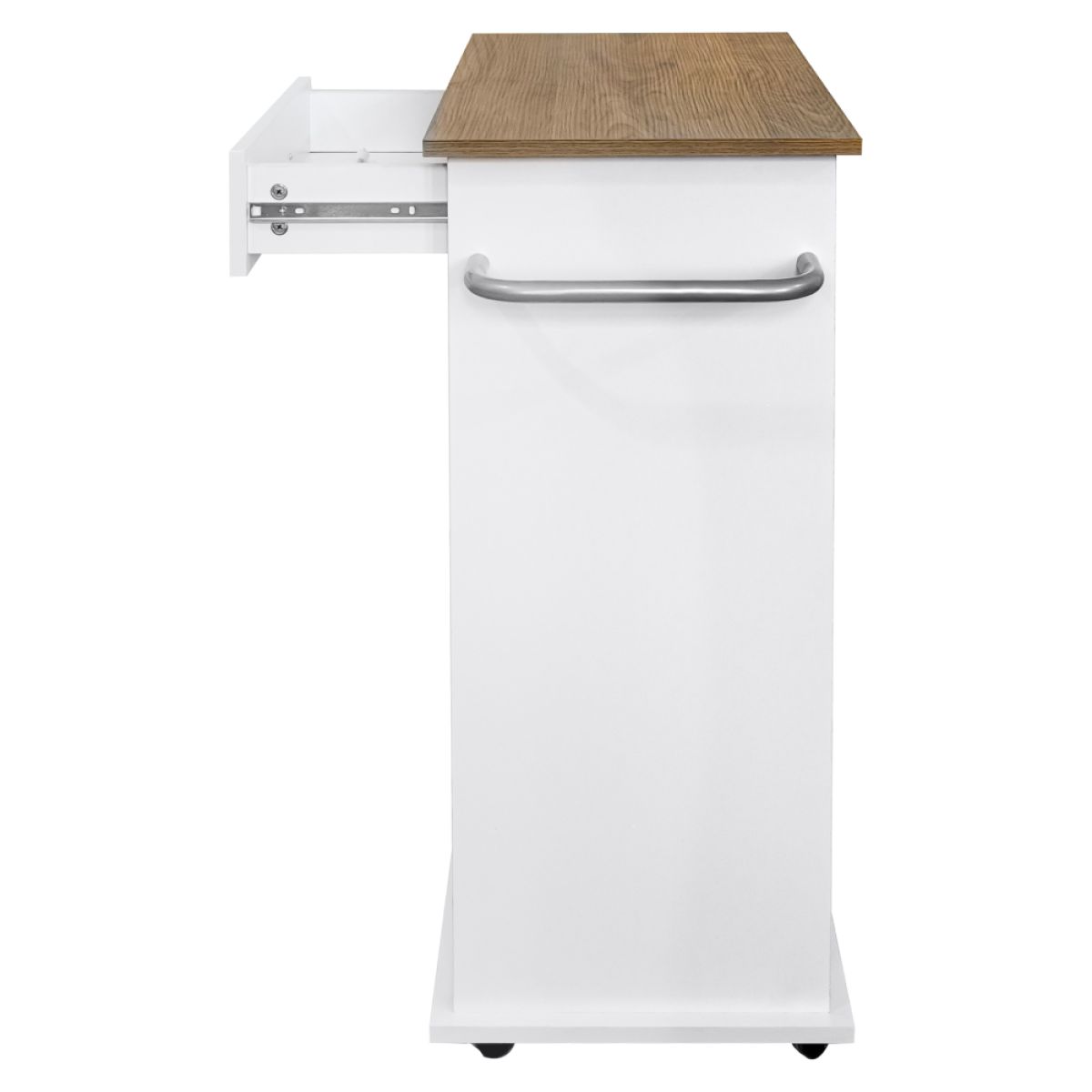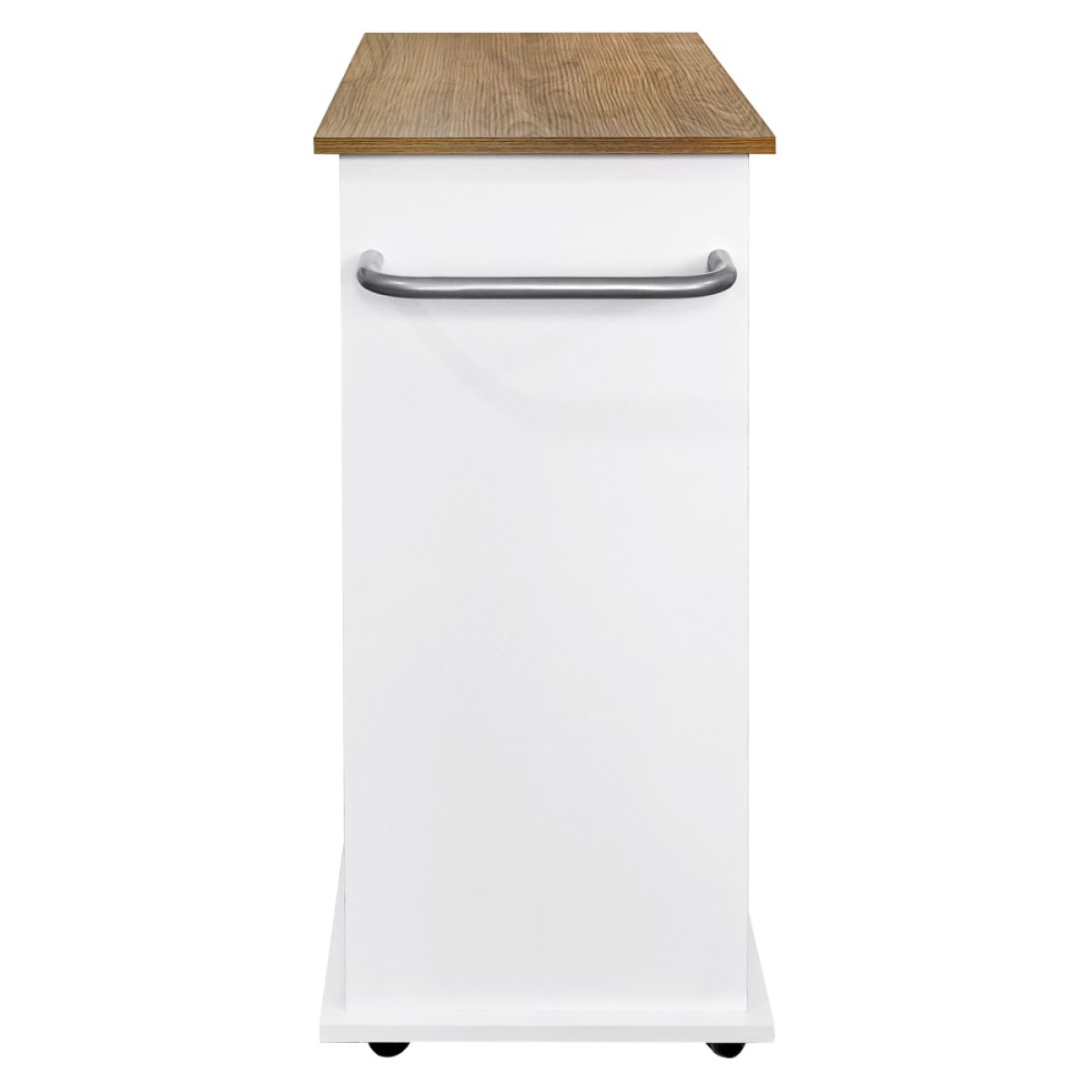 Material: MDF înfoliat Culoare: alb/stejar Dimensiuni (lxAxh): 73x38x89 cm Grosime material: 1,2-1,5 kg Sertar Dimensiuni sertar (lxh): 40,5x11,5 cm Dimensiunile interioare ale sertarului (lxAxh): 36,5x28,7x6,6 cm 3 poliţe laterale Apărători pe poliţe Suport metalic Uşă cu deschidere batantă Livrat cu coş de gunoi Coş de gunoi detaşabil Dimensiuni coş (lxAxh): 27,5x20x31 cm Volumul coşului: 14 l Inel pentru ataşarea sacului Pe roţi Roţi cu frâne Înălţimea roţilor: 6,5 cm Mânere argintii Material mâner: metal Ideal pentru bucătărie, birou sau cameră tehnică. Multifuncţional Portanţă: 20 kg Livrat dezasamblat
