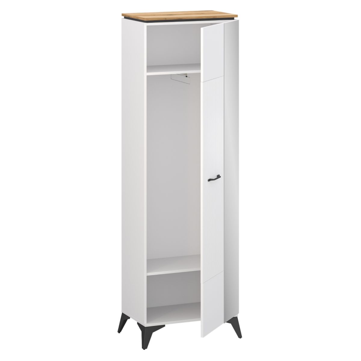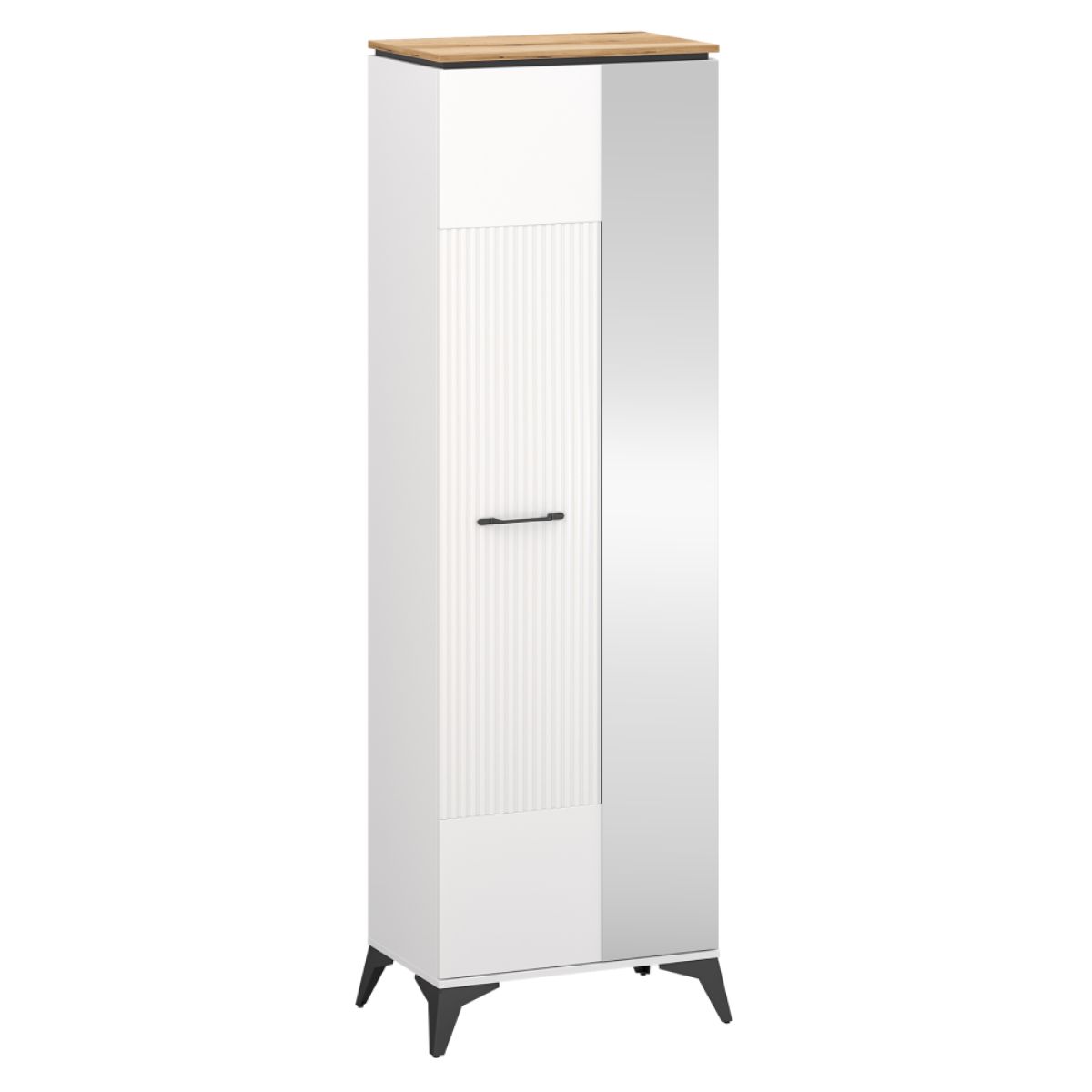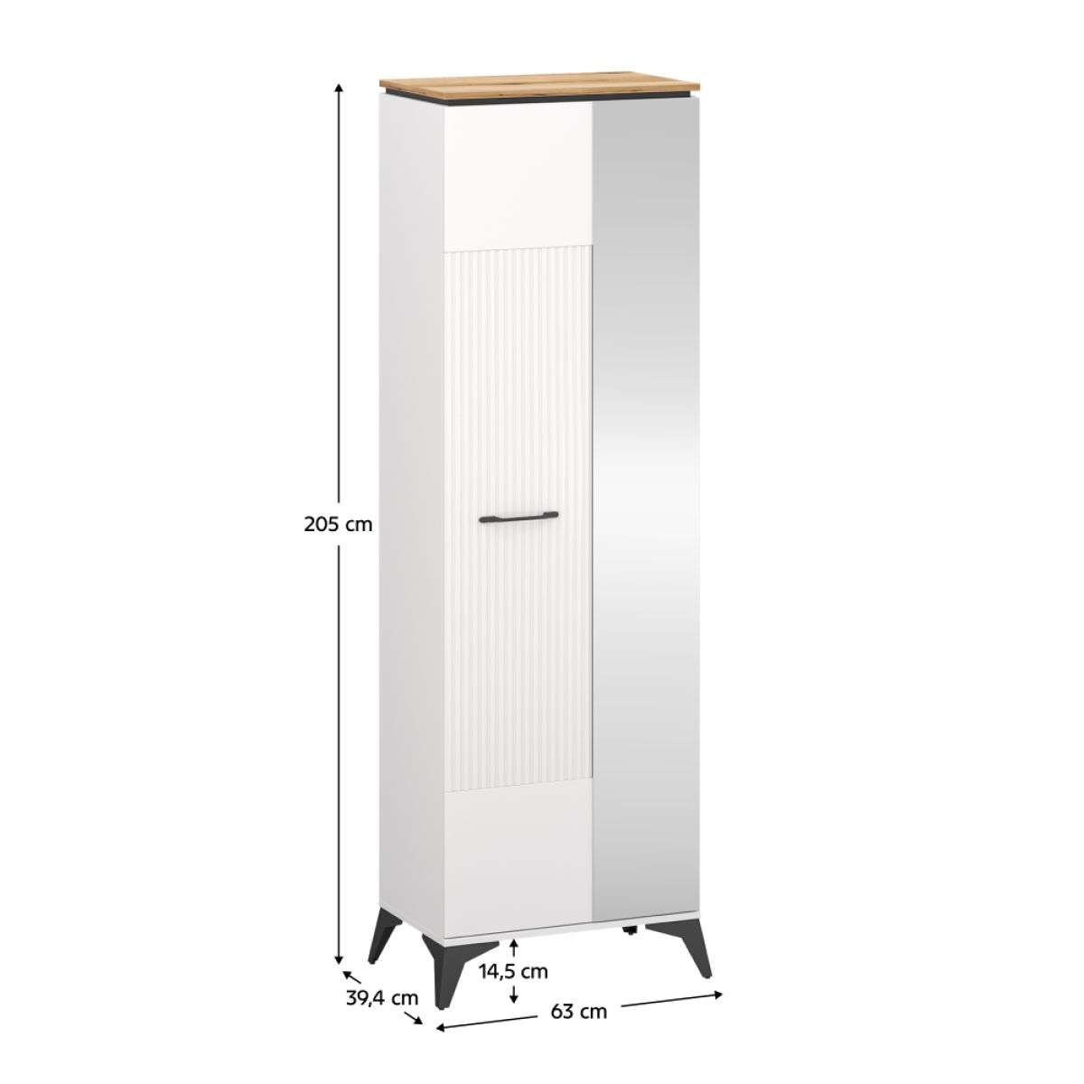 Material: DTD laminat/MDF înfoliat/PVC Culoare: alb/stejar evoke Dimensiuni (lxAxh): 63x39,4x205 cm Grosimea materialului: 1,6 cm Cu o uşă Cu oglindă Poliţă Bară de umeraşe extensibilă Portanţă poliţă: 3 kg Mânere metalice Culoare mânere: neagră Pe picioare Culoare picioare: negre Înălţime picioare: 14,5 cm Uşă frezată decorativ Design modern Recomandăm fixarea de perete Livrată dezasamblată