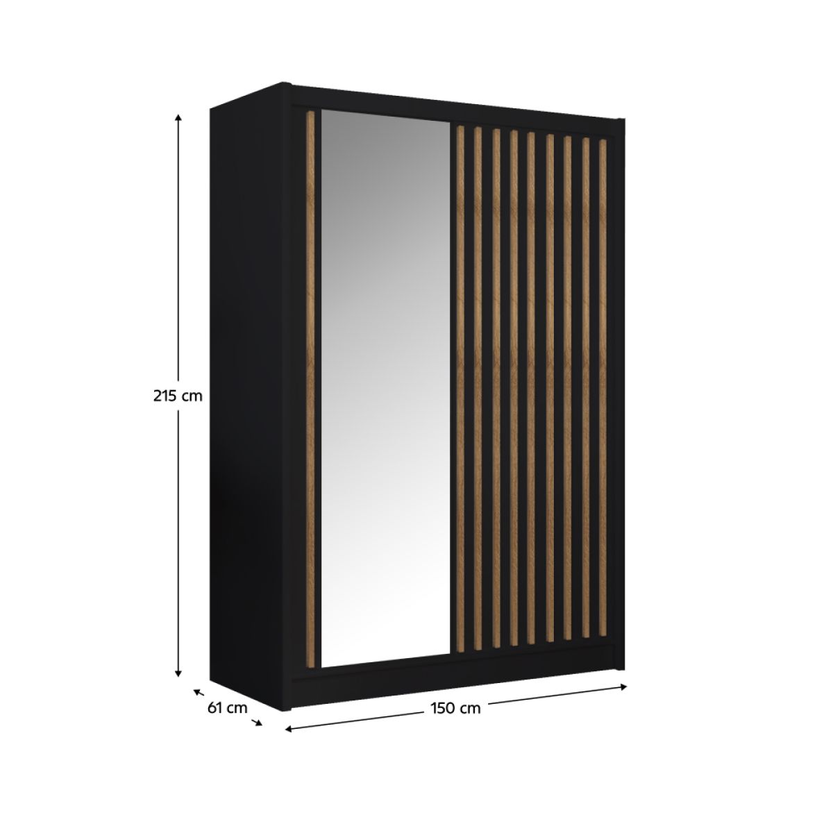 Material: PAL melaminat / margini ABS / fâşii MDF / sticlă Culoare: neagră / stejar craft Dimensiuni (LxAxÎ): 150x61x215 cm Grosimea PAL: 1,6 cm Grosimea lamelelor: 2,5 cm Grosime ABS: 0,045 cm Capacitatea de încărcare a raftului: 10 kg Capacitatea de încărcare a raftului lung: 20 kg Capacitate de încărcare a barei pentru umeraşe: 15 kg Capacitate sertar: 3 kg Cu uşi glisante Cu oglindă Zonă cu rafturi Bară pentru umeraşe Uşă dublă Livrat dezasamblat