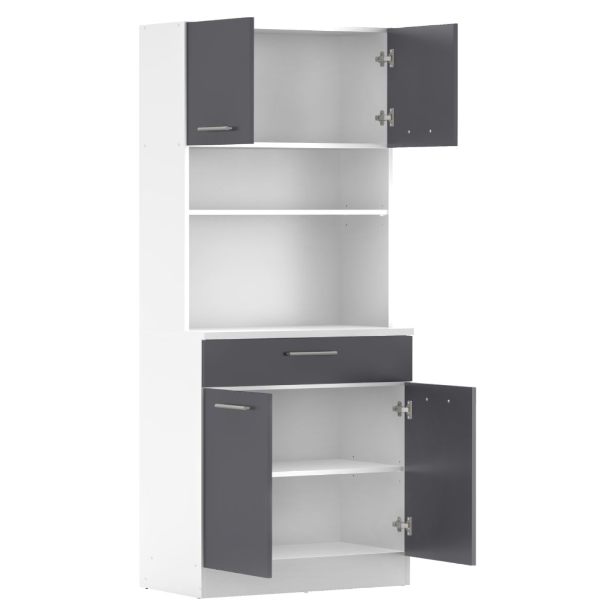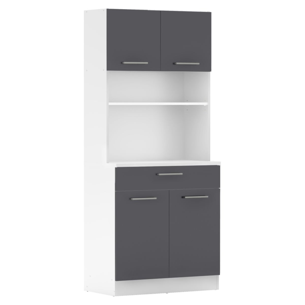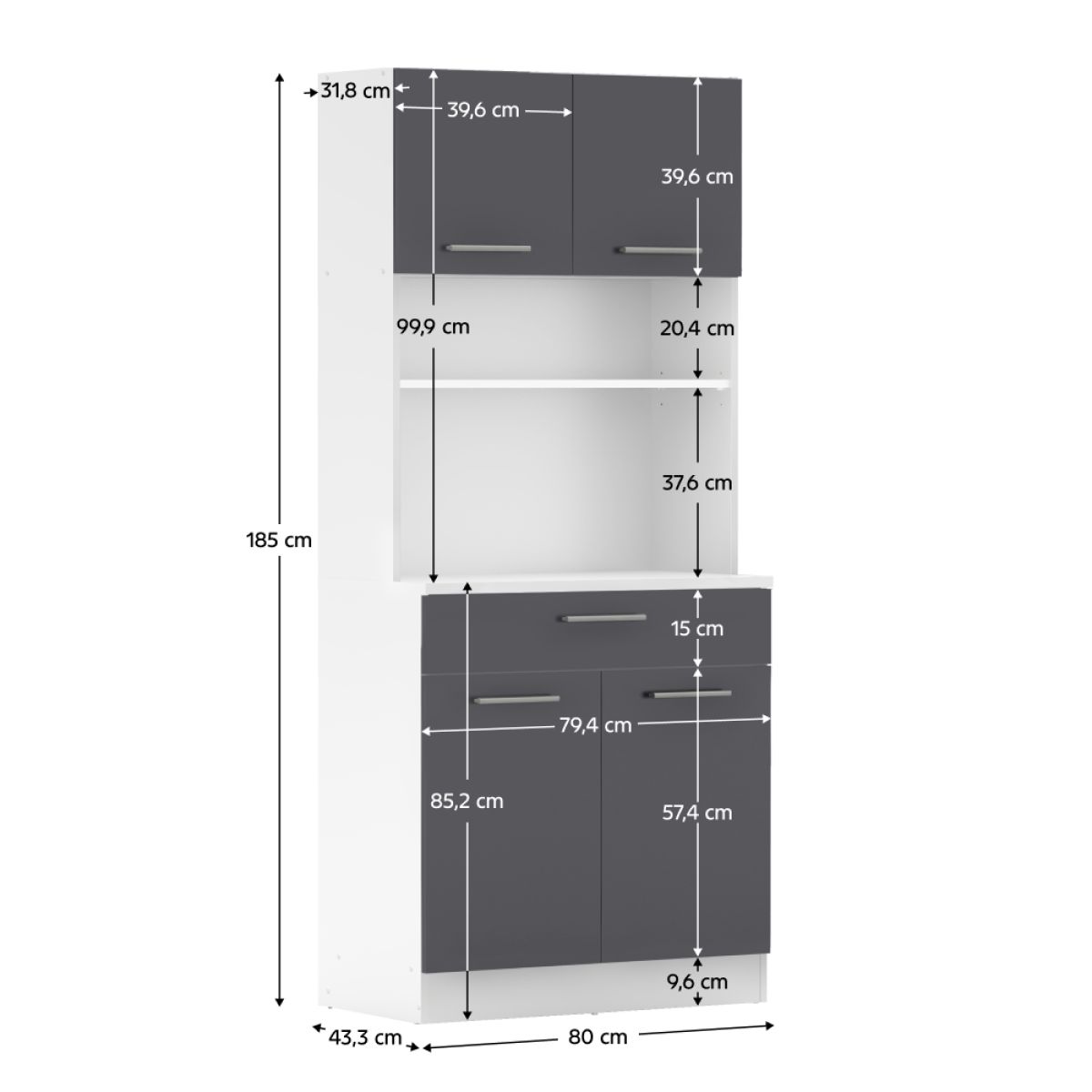 Material: DTD laminat Culoare:albă/grafit Dimensiuni (lxAxh): 80x43,3x185 cm Grosimea materialului: 1,6 cm Grosimea plăcii superioare a dulapului inferior: 2,2 cm Cu patru uşi Portanţa poliţei: 5 kg 1 sertar Dimensiuni sertar (lxh): 79,4x15 cm Portanţă sertar: 5 kg Cu mânere Material mâner: PVC Culoare mânere: argintiu Pe glisoare Practic Multifuncţional Produs slovac de calitate Recomandăm fixarea pe perete Livrat dezasamblat