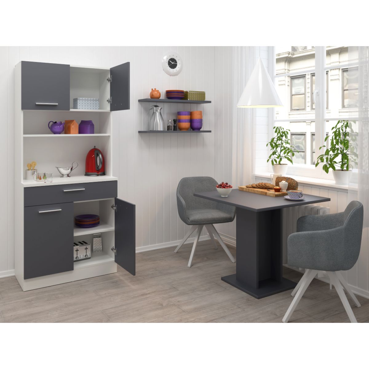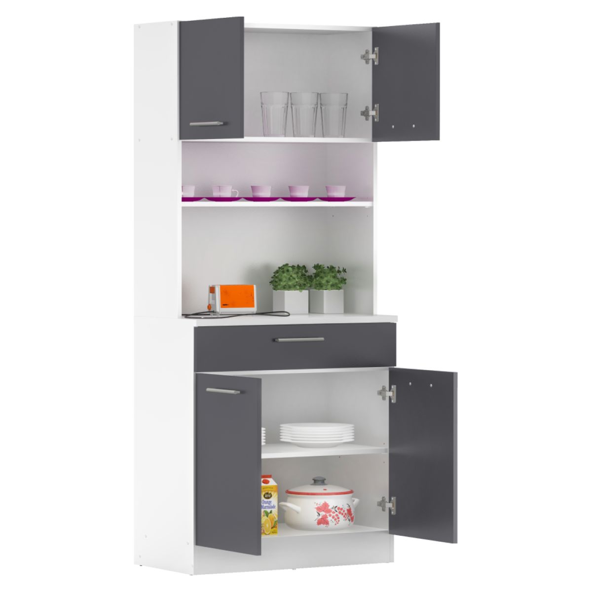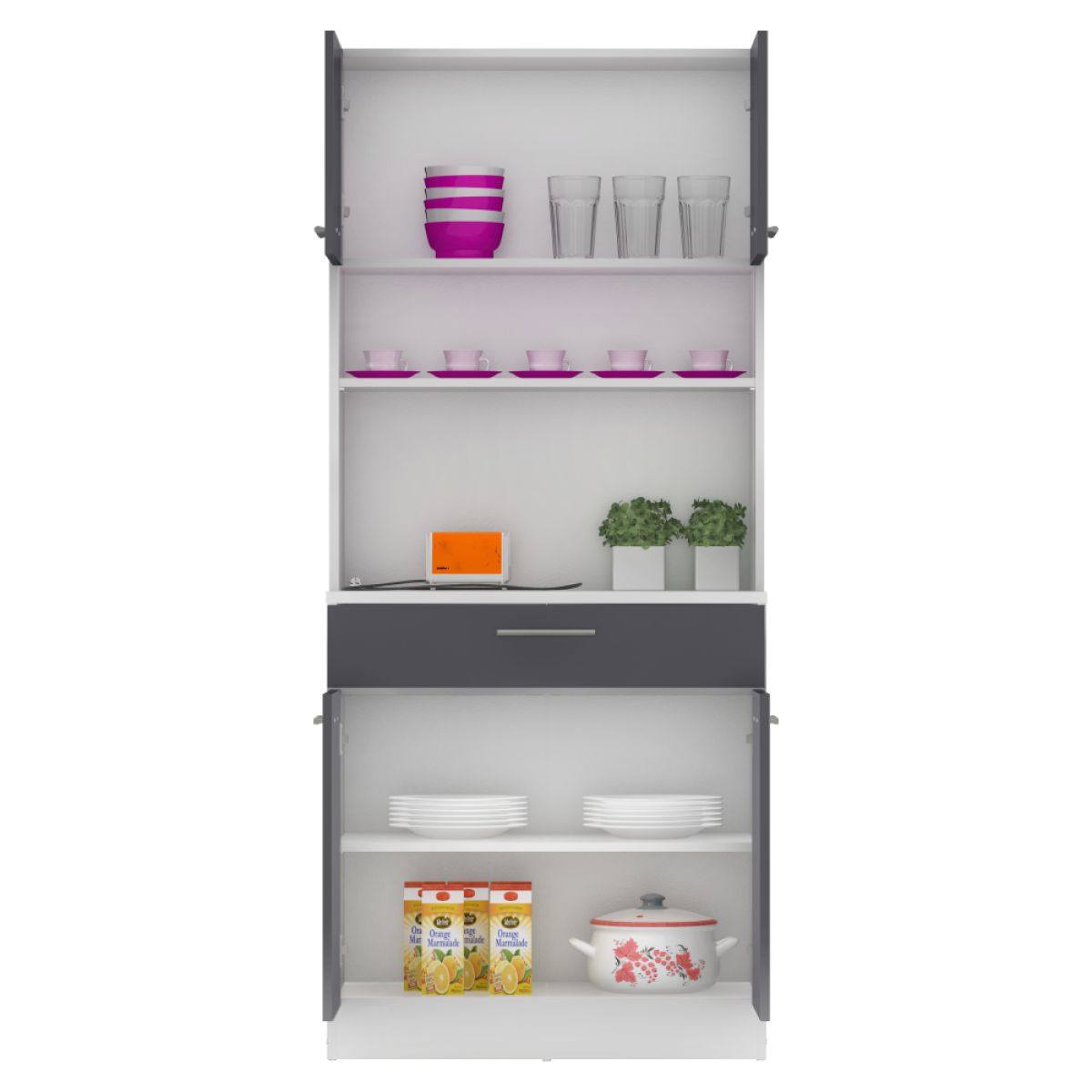 Material: DTD laminat Culoare:albă/grafit Dimensiuni (lxAxh): 80x43,3x185 cm Grosimea materialului: 1,6 cm Grosimea plăcii superioare a dulapului inferior: 2,2 cm Cu patru uşi Portanţa poliţei: 5 kg 1 sertar Dimensiuni sertar (lxh): 79,4x15 cm Portanţă sertar: 5 kg Cu mânere Material mâner: PVC Culoare mânere: argintiu Pe glisoare Practic Multifuncţional Produs slovac de calitate Recomandăm fixarea pe perete Livrat dezasamblat