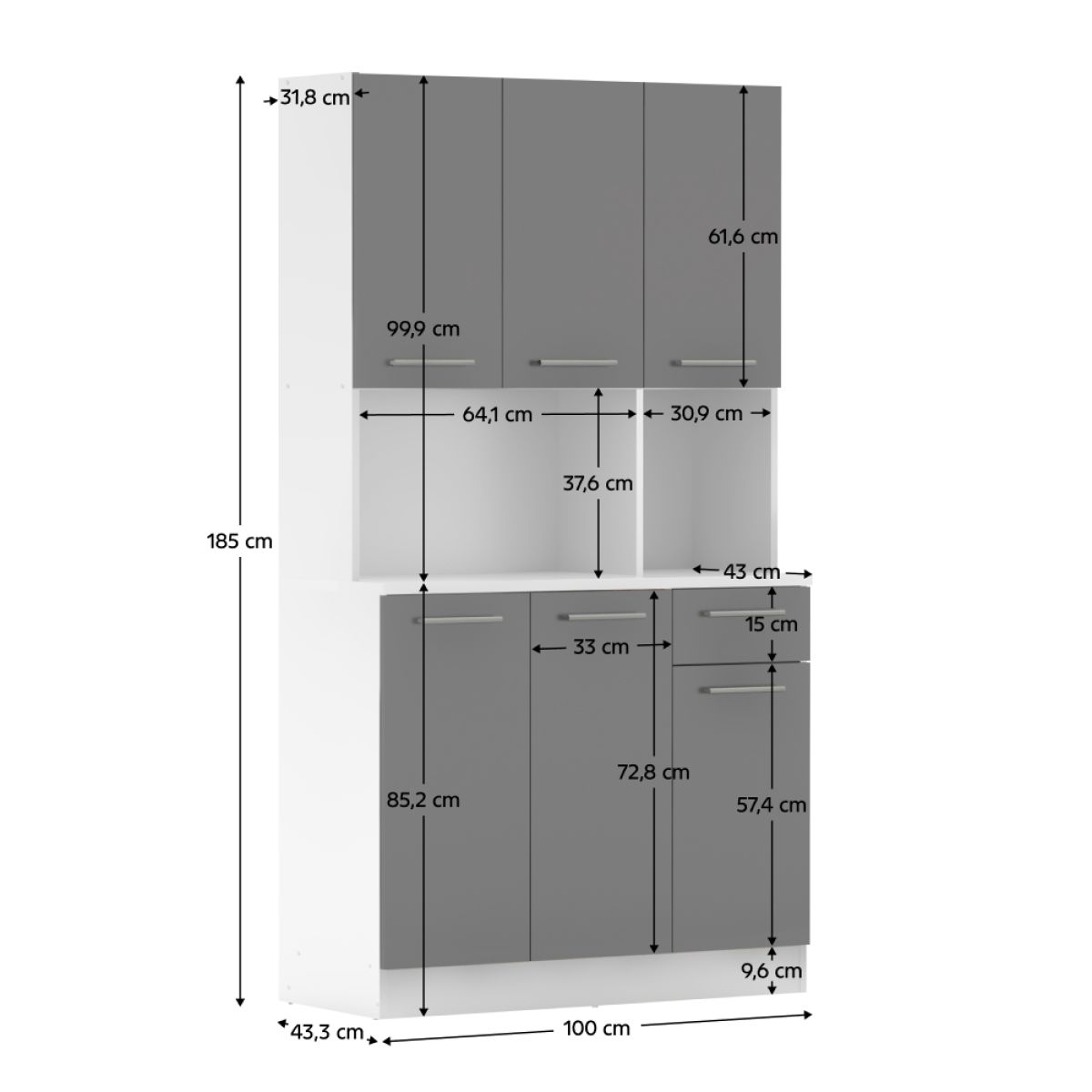 Material: DTD laminat Culoare:albă/grafit Dimensiuni (lxAxh): 100x43,3x185 cm Grosimea materialului: 1,6 cm Grosimea plăcii superioare a dulapului inferior: 2,2 cm Cu şase uşi Cu poliţe Portanţa poliţei: 5 kg 1 sertar Dimensiuni sertar (lxh): 30,9x15 cm Cu mânere Material mânere: PVC Culoare mânere: argintiu Pe glisoare Practic Multifuncţional Produs slovac de calitate Recomandăm fixarea pe perete Livrat dezasamblat