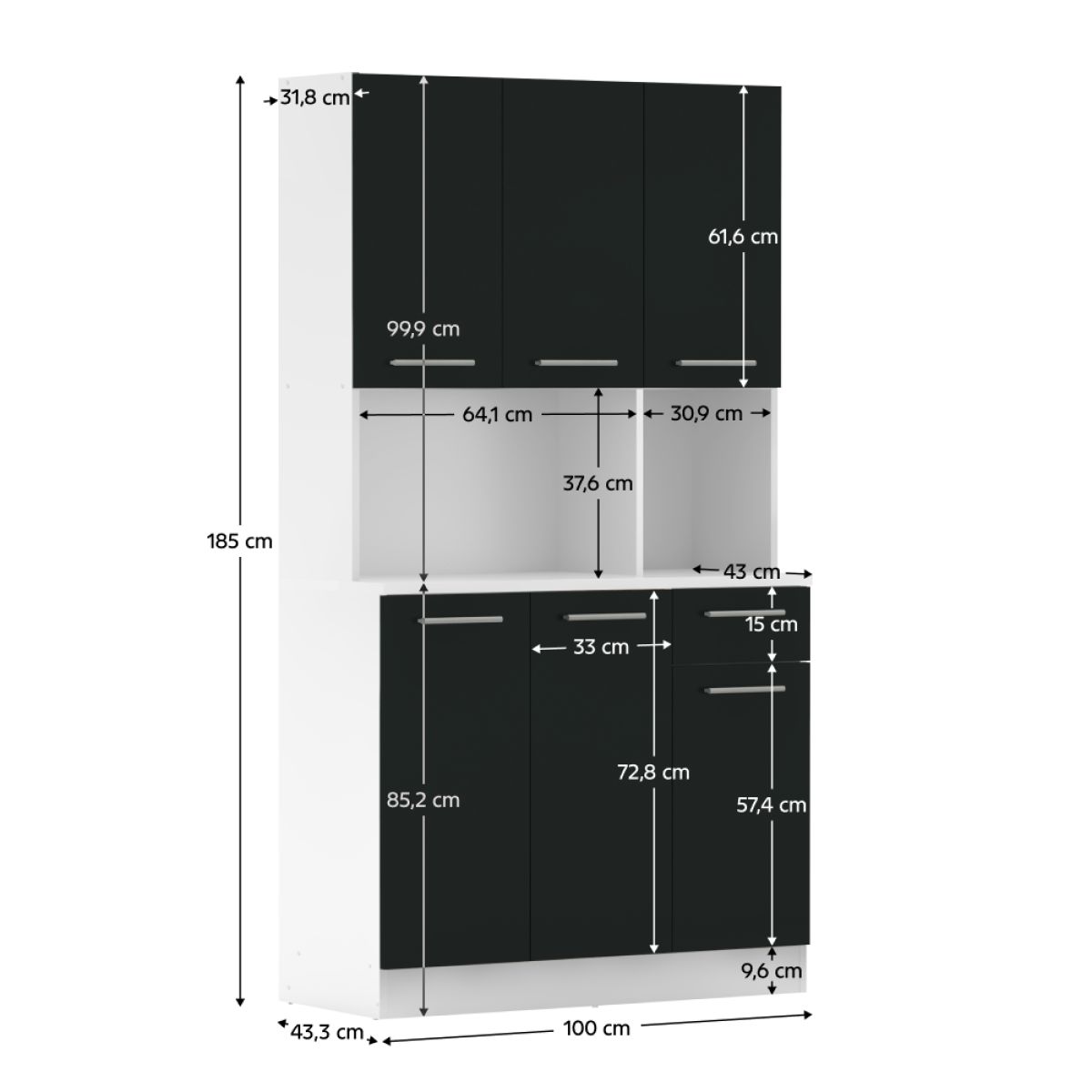 Material: DTD laminat/metal Culoare: albă/neagră Dimensiuni (lxAxh): 100x43,3x185 cm Grosimea materialului: 1,6 cm Grosimea plăcii superioare a dulapului inferior: 2,2 cm Cu şase uşi Cu poliţe Portanţa poliţei: 5 kg 1 sertar Dimensiuni sertar (lxh): 30,9x15 cm Cu mânere Material mânere: PVC Culoare mânere: argintiu Pe glisoare Practic Multifuncţional Produs slovac de calitate Recomandăm fixarea pe perete Livrat dezasamblat