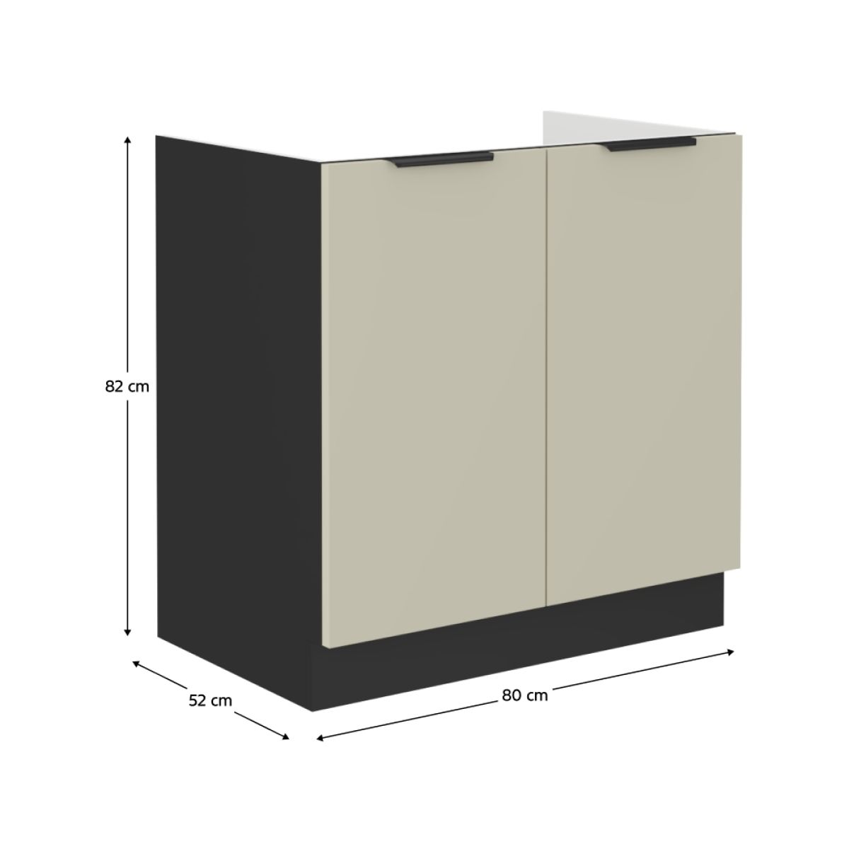 Material: DTD laminat Culoarea uşii: caşmir Culoarea dulapului: negru mat Dimensiuni (Lxlxh): 80x52x82 cm Grosime material: 1,6 cm Pentru chiuvetă Cu două uşi, Cu mânere metalice, Culoarea mânerului: aluminiu, Design modern, Cu sistem de închidere silenţioasă a uşilor Cu şină inferioară/soclu, Fără blat de lucru, Furnizat fără chiuvetă, Cu posibilitatea de a cumpăra chiuveta universală LAY ON, Se livrează dezasamblat, Dulapurile inferioare sunt furnizate împreună cu şina inferioară, fără blat de lucru. Opţiunea de a achiziţiona blat de lucru din marmură roma la preţul de 339 Lei/ml. Opţiunea de a achiziţiona o chiuvetă universală LAY ON.