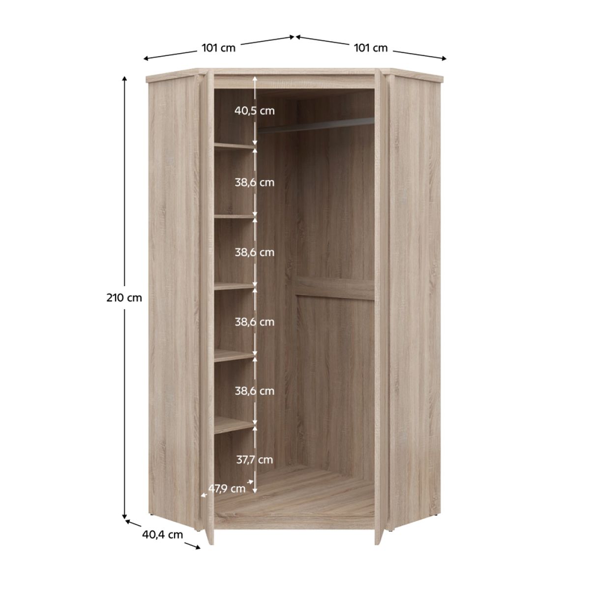 Material: DTD melaminat Culoare: stejar sonoma Dimensiuni (Lxlxh): 101x101x210 cm Grosime material: 3,2 cm Grosimea materialului celelalte părţi: 1,6 cm Spaţiu de depozitare Uşă dublă Partea poliţei Portanţa poliţei: 5 kg Bară pentru umeraşe Portanţa barei pentru umeraşe: 15 kg De colţ Livrat dezasamblat