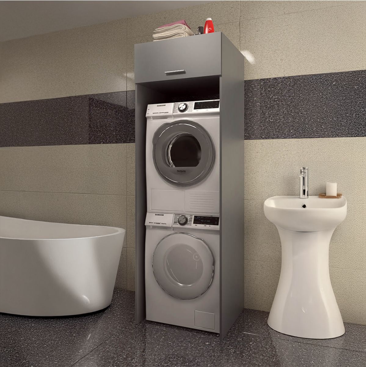 Material: DTD laminat Culoare: grafit Dimensiuni (Lxlxh): 67,5x67x210 cm Spaţiu pentru maşină de spălat şi uscător (Lxlxh): 64x65x180 cm Grosime material: 1.6 cm Spaţiu de depozitare deschis Dulăpior batant Portanţă dulăpior: 5 kg Cu mâner Potrivit pentru maşină de spălat şi uscător Aduce organizare şi organizare la baie şi spălătorie Recomandăm fixarea de perete Produs slovac de calitate Livrat dezasamblat