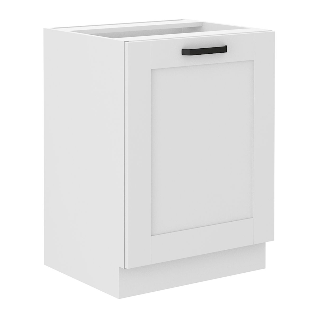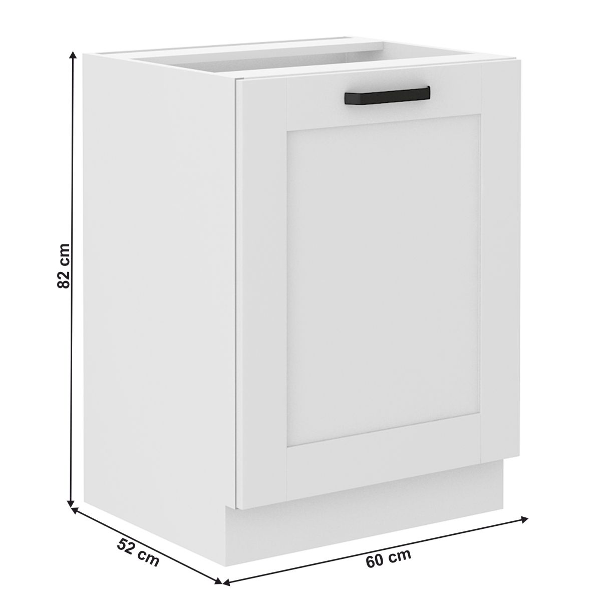 Dulap inferior LULA 60 D 1F BB Material: laminat HDF/MDF Culoare: albă Dimensiuni (LxAxÎ): 60x52x82 cm Grosime material: 1,6 cm Cu uşă Grosime uşă: 2 cm Cu raft, Cu mâner metalic, Culoare mâner: neagră, Cu şină inferioară/plintă, Fără blat, Design dinamic modern, Livrat dezasamblat, Opţiunea de a cumpăra o chiuvetă universală LAY ON, Dulapurile inferioare sunt furnizate împreună cu şina inferioară, Fără blat de lucru. Opţiunea de a achiziţiona blat de lucru din stejar artisan sau marmură roma la preţul de 319/metru liniar. Opţiunea de a achiziţiona o chiuvetă universală LAY ON.