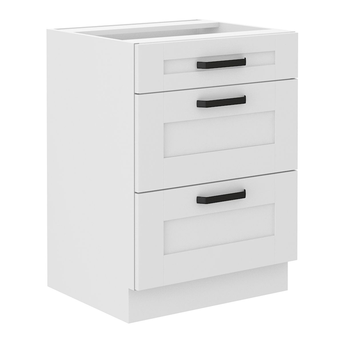 Dulap inferior LULA 60 D 3S BB Material: laminat HDF Culoare: albă Dimensiuni (LxAxÎ): 60x52x82 cm Grosime material: 1,6 cm Cu sertare, 3 sertare, Cu mâner metalic, Culoare mâner: neagră, Cu şină inferioară/plintă, Fără blat de lucru, Design dinamic modern, Se livrează dezasamblat, Opţiunea de a achiziţiona o chiuvetă universală LAY ON, Dulapurile inferioare sunt furnizate împreună cu şina inferioară, Fără blat de lucru. Opţiunea de a achiziţiona blat de lucru din stejar artisan sau marmură roma la preţul de 319/metru liniar. Opţiunea de a achiziţiona o chiuvetă universală LAY ON.