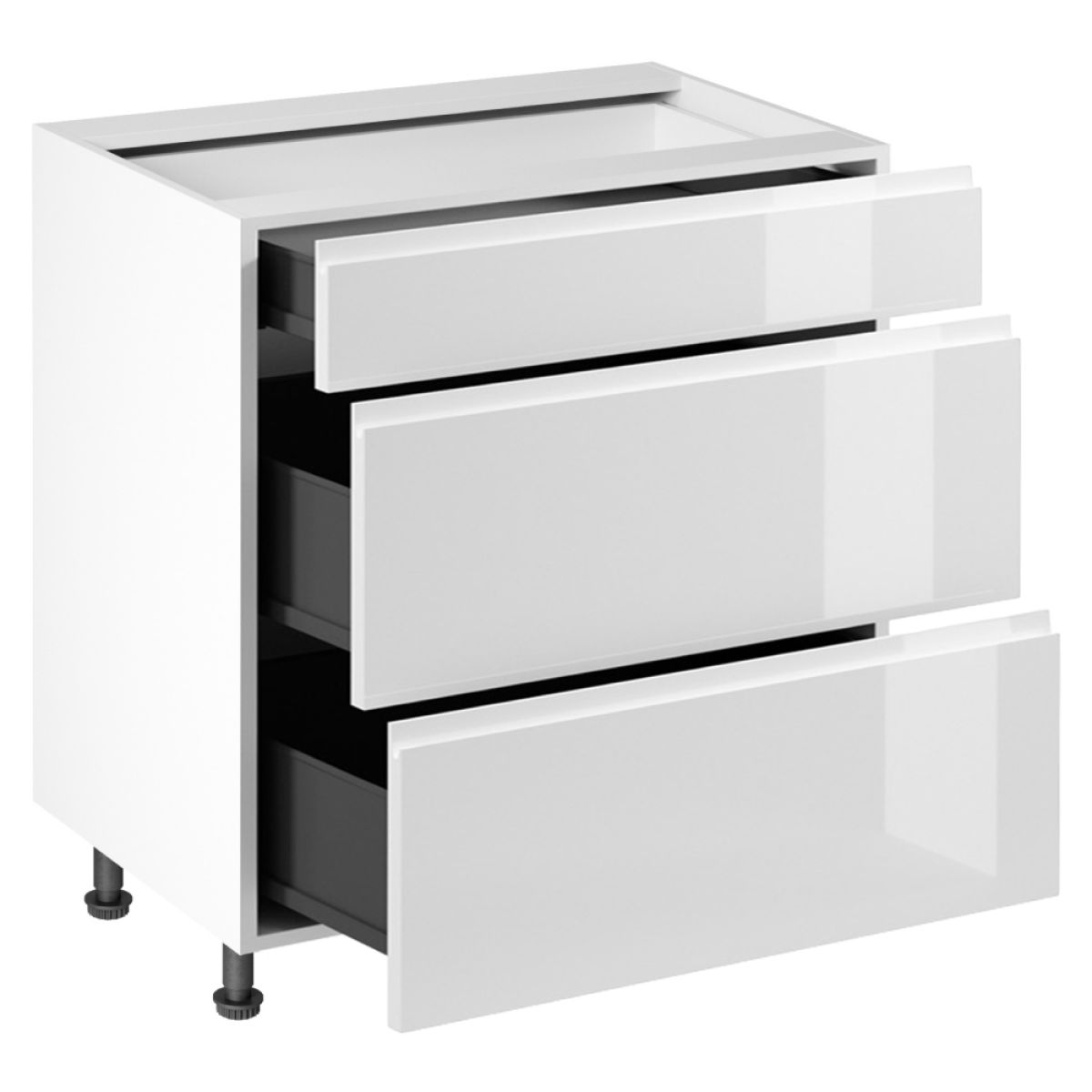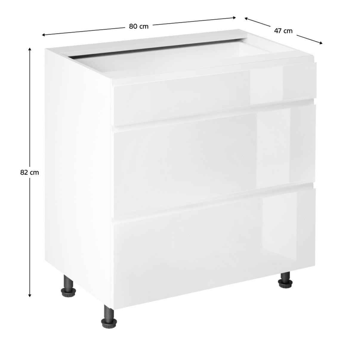 Dulap inferior, Aurora D80S3 Material: DTD laminat/MDF Culoare: alb/alb luciu extra ridicat Dimensiuni (LxGxÎ): 80x47x82 cm Sistem închidere uşoară şi silenţioasă a uşilor 3 sertare Sertar tip METALBOX Sistem de închidere silenţioasă a sertarelor Fără mânere Furnizat nemontat. Posibilitatea de a cumpăra plinta de 1 m la preţul de 39 ,- sau de 2 m la preţul de 78,-. Preţul finisajului pentru soclu cu adâncimea de 47 cm sau 58 cm este de 28 ,-. Pentru fiecare cabinet inferior, înafară de D25PZ, trebuie să cumpăraţi 2 suporturi de fixare pentru plintă - preţul 6,-/2buc. Blatul de lucru nu este inclus. Preţul blatului de lucru stejar artizanal închis este 339,- pe m - grosime de 38 de mm. Puteţi cumpăra şi o chiuvetă universală D/S LAY ON.