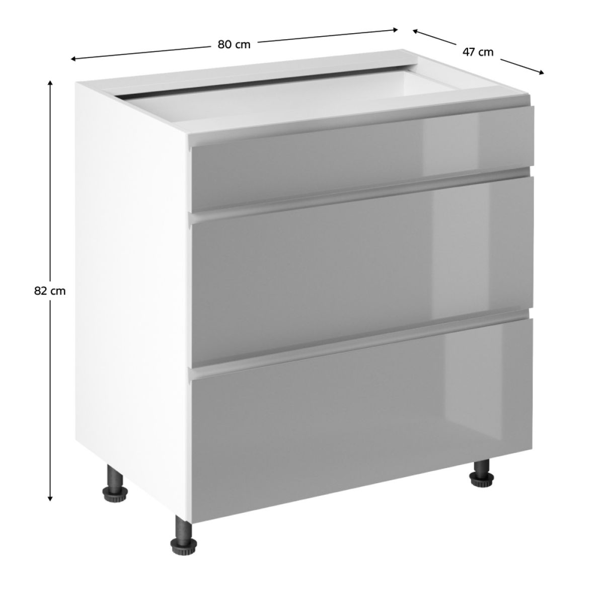 Dulap inferior AURORA D80S3 Material: PAL melaminat/MDF Culoare: alb/gri extra lucios Dimensiuni (lxhxA): 80x82x47 cm Grosimea materialului: 15 mm Sistem închidere uşoară şi silenţioasă a uşilor 3 sertare Fără mânere Sertar tip METALBOX Sistem de închidere silenţioasă a sertarelor Livrat nemontat Posibilitatea de a cumpăra plinta de 1 m la preţul de 39 ,- sau de 2 m la preţul de 78,-. Preţul finisajului pentru soclu cu adâncimea de 47 cm sau 58 cm este de 28 ,-. Pentru fiecare cabinet inferior, înafară de D25PZ, trebuie să cumpăraţi 2 suporturi de fixare pentru plintă - preţul 6,-/2buc. Blatul de lucru nu este inclus. Preţul blatului de lucru stejar artizanal închis este 339,- pe m - grosime de 38 de mm. Puteţi cumpăra şi o chiuvetă universală D/S LAY ON.