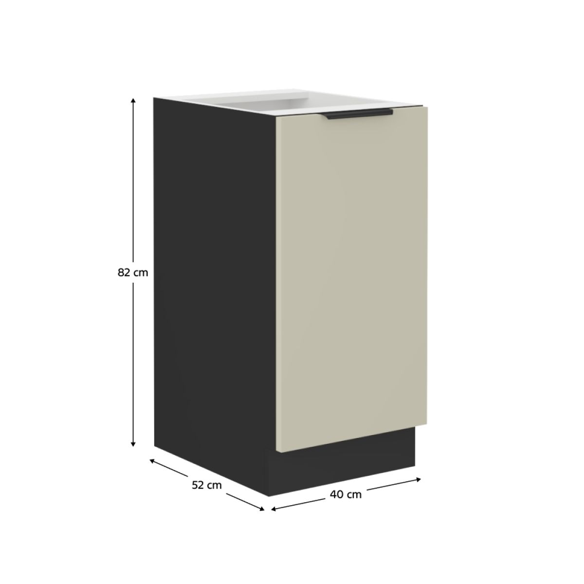 Material: DTD laminat Culoarea uşii: caşmir Culoarea dulapului: negru mat Dimensiuni (Lxlxh): 40x52x82 cm Grosime material: 1,6 cm Cu uşi, Rafturi, Cu mâner metalic Culoarea mânerului: neagră Fără blat de lucru Cu şină inferioară/plintă Sistem de oprire silenţioasă a sertarelor Design modern Opţiune de achiziţionare a unei chiuvete universale LAY ON Se livrează dezasamblat Dulapurile inferioare sunt furnizate împreună cu şina inferioară, fără blat de lucru. Opţiunea de a achiziţiona blat de lucru din marmură roma la preţul de 339 Lei/ml. Opţiunea de a achiziţiona o chiuvetă universală LAY ON.