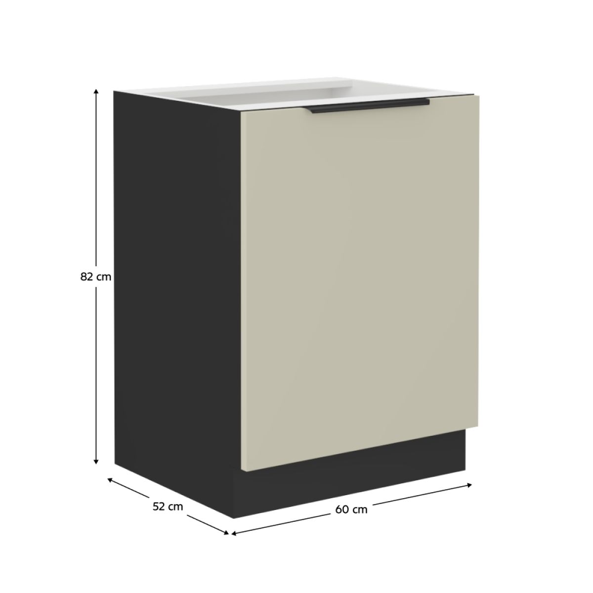 Material: DTD laminat Culoarea uşii: caşmir Culoarea dulapului: negru mat Dimensiuni (Lxlxh): 60x52x82 cm Grosime material: 1,6 cm Cu uşi, Rafturi, Cu mâner metalic Culoarea mânerului: neagră Fără blat de lucru Cu şină inferioară/plintă Sistem de oprire silenţioasă a sertarelor Design modern Opţiune de achiziţionare a unei chiuvete universale LAY ON Se livrează dezasamblat Dulapurile inferioare sunt furnizate împreună cu şina inferioară, fără blat de lucru. Opţiunea de a achiziţiona blat de lucru din marmură roma la preţul de 339 Lei/ml. Opţiunea de a achiziţiona o chiuvetă universală LAY ON.