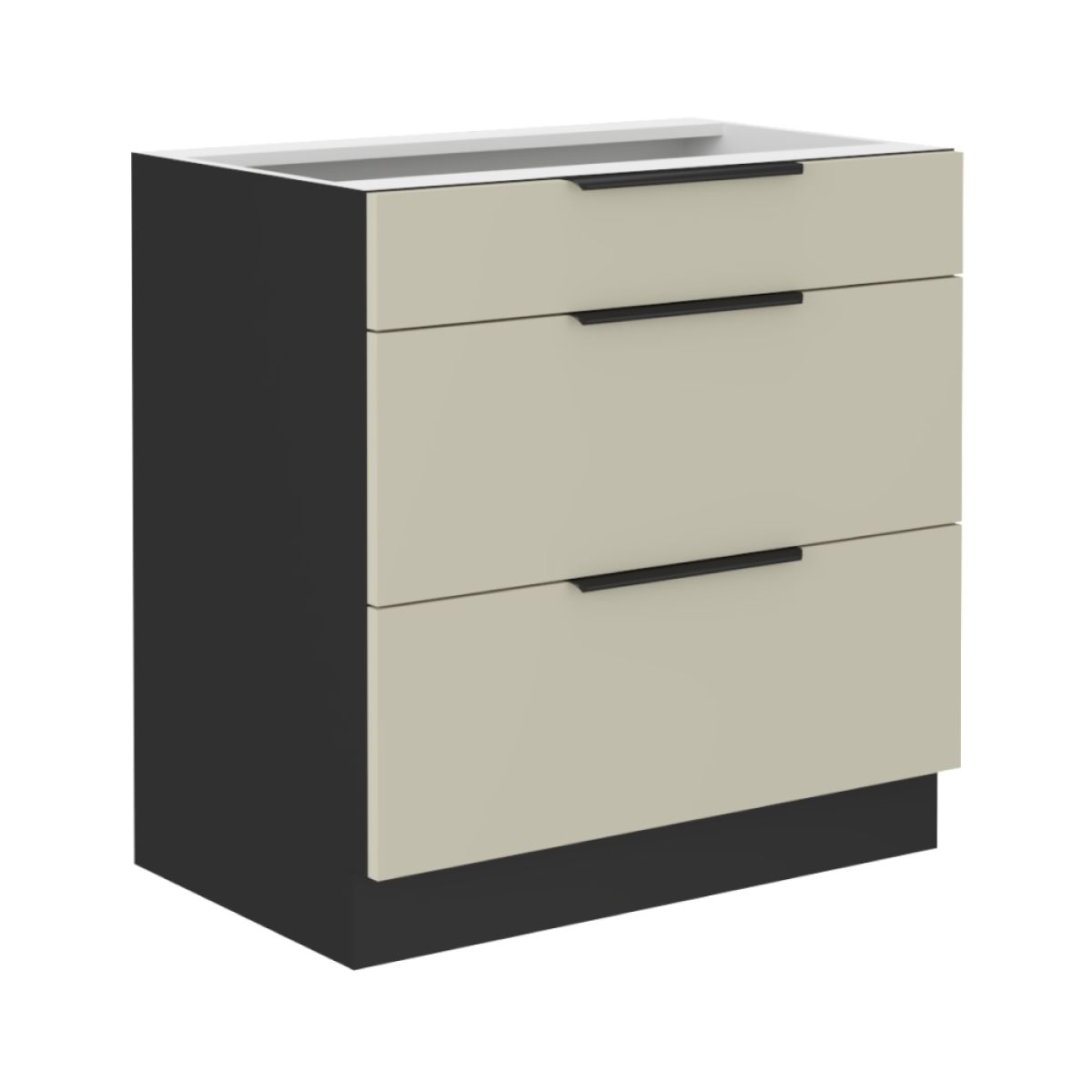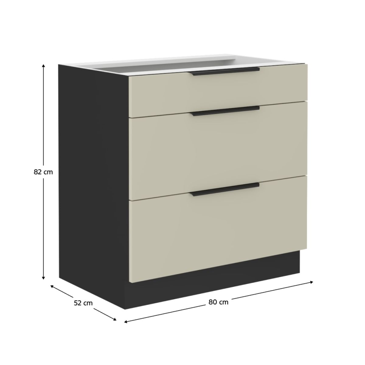 Material: DTD laminat Culoarea uşii: caşmir Culoarea dulapului: negru mat Dimensiuni (Lxlxh): 80x52x82 cm Grosime material: 1,6 cm Cu sertare 3 sertare Cu mâner Culoarea mânerului: aluminiu Fără blat Cu şină inferioară / soclu Design modern Oprire silenţioasă a sertarului Sertar de tip PREMIUM-BOX cu lateralele din oţel Cu posibilitatea de a achiziţiona chiuveta universală LAY ON Se livrează dezasamblate Dulapurile inferioare se livrează cu şină inferioară inclusă, fără blat. Opţiunea de a achiziţiona blat de lucru din marmură roma la preţul de 339 Lei/ml. Opţiunea de a achiziţiona o chiuvetă universală LAY ON.