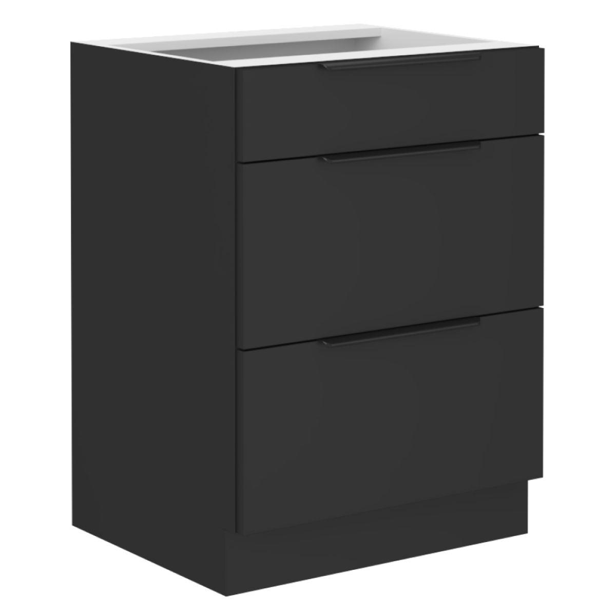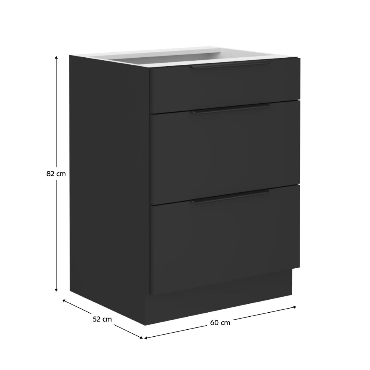 Material: DTD laminat Culoarea uşii: negru Culoarea corpului: negru mat Dimensiuni (Lxlxh): 60x52x82 cm Grosime material: 1,6 cm 3 sertare Cu mâner Culoarea mânerului: aluminiu Fără blat Cu şină inferioară/plintă Sistem de oprire silenţioasă a sertarelor Sertar tip PREMIUM BOX cu pereţi din oţel Design modern Se poate achiziţiona chiuveta universală LAY ON Se livrează dezasamblate Dulapurile din sectorul inferior sunt livrate cu şină inferioară (plintă), fără blat. Blatul de lucru cu o grosime de 3,8 cm poate fi comandat separat în finisaj de tip stejar artisan la preţul de 339 Lei/ml.