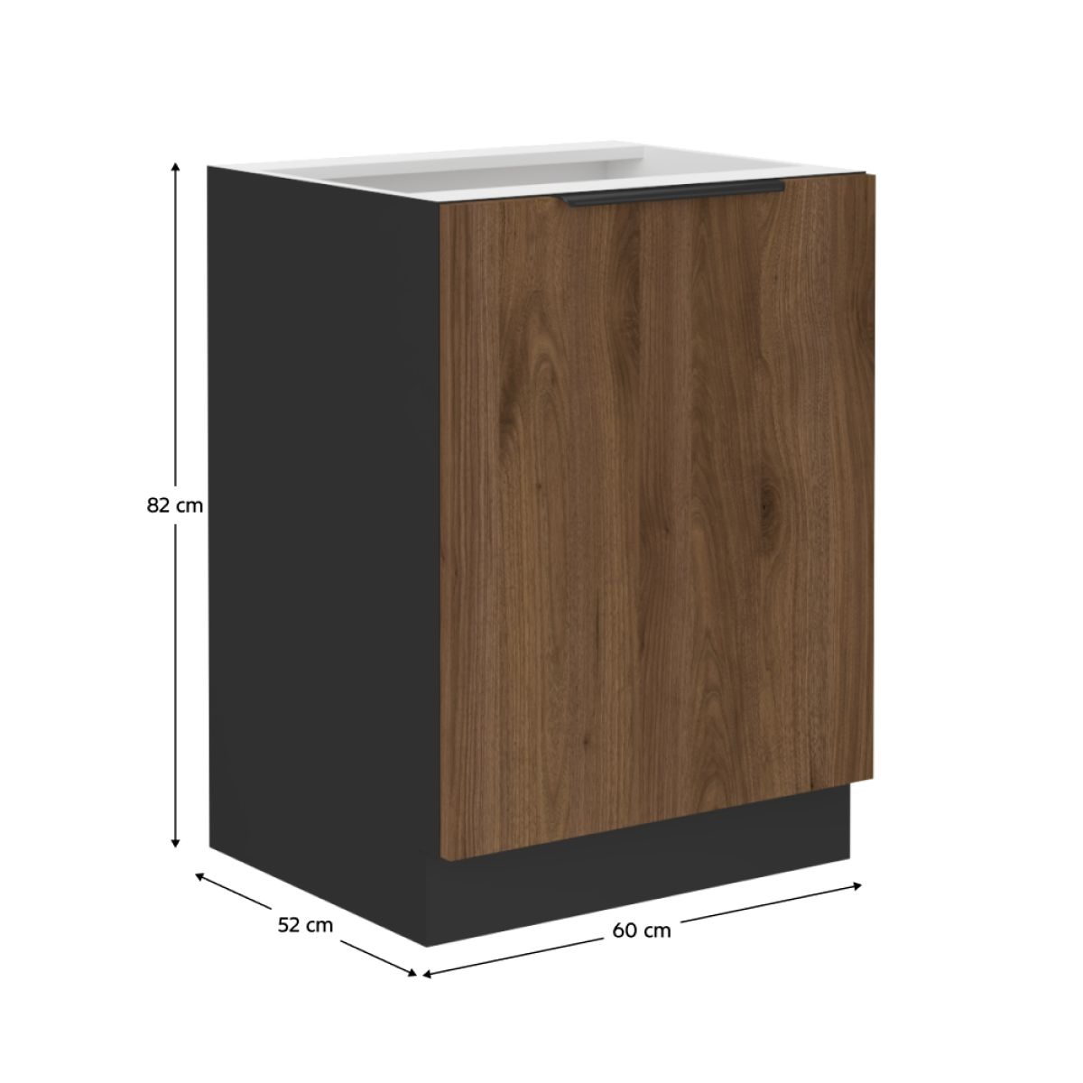 Material: DTD laminat Culoarea uşii: nuc okapi Culoarea dulapului: negru mat Dimensiuni (Lxlxh): 60x52x82 cm Grosime material: 1,6 cm Cu uşă, Cu raft, Cu mâner metalic, Culoarea mânerului: neagră, Cu şină inferioară/plintă, Fără blat de lucru, Sistem de închidere silenţioasă a uşilor Design modern Se poate achiziţiona suplimentar chiuvetă universală LAY ON Livrat dezasamblat Dulapurile inferioare sunt furnizate cu şină inferioară inclusă, fără blat. Opţiunea de a achiziţiona blat de lucru din marmură roma la preţul de 339,-/m. Opţiunea de a achiziţiona o chiuvetă universală LAY ON.