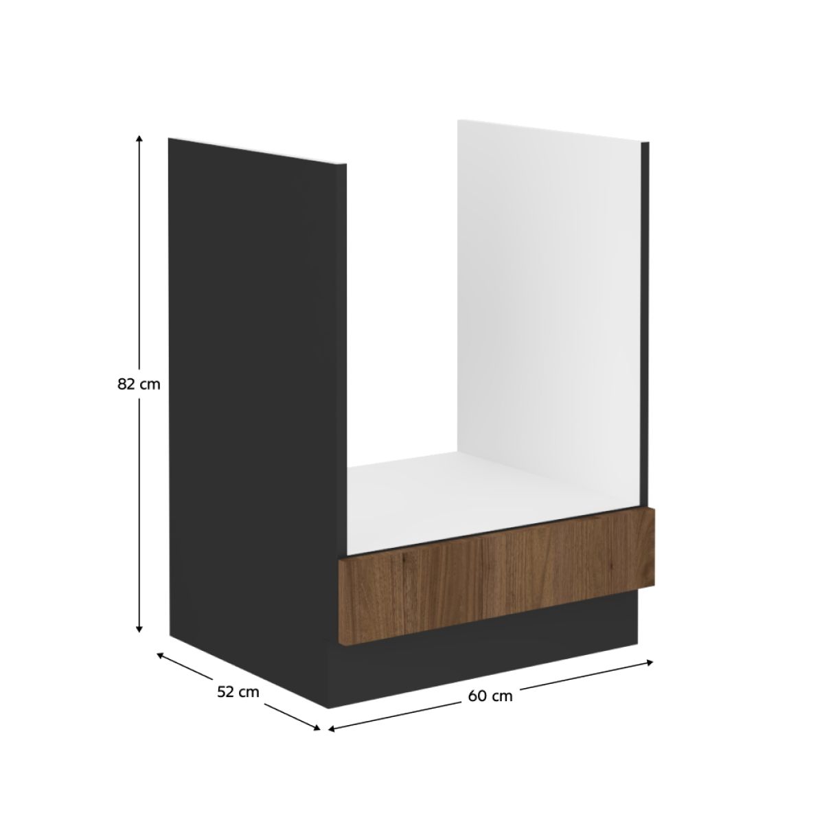 Material: DTD laminat Culoare: nuc okapi Culoarea dulapului: negru mat Dimensiuni (Lxlxh): 60x52x82 cm Grosime material: 1,6 cm Rafturi, Cu şină inferioară/plintă, Fără blat de lucru Pentru aragaz încorporat Design modern Livrat dezasamblat Opţiunea de a cumpăra o chiuvetă universală LAY ON Dulapurile inferioare sunt furnizate împreună cu şina inferioară fără blat de lucru. Opţiunea de a achiziţiona blat de lucru din marmură roma la preţul de 339,-/m. Opţiunea de a achiziţiona o chiuvetă universală LAY ON.