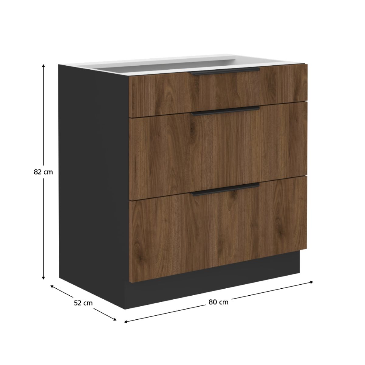 Material: DTD laminat Culoarea uşii: nuc okapi Culoarea dulapului: negru mat Dimensiuni (Lxlxh): 80x52x82 cm Grosime material: 1,6 cm Sertar 3 sertare Cu mâner Culoarea mânerului: aluminiu Fără blat Cu şină inferioară / soclu Sertar tip PREMIUM-BOX cu lateralele din oţel Sistem de oprire silenţioasă a sertarului Se poate achiziţiona suplimentar chiuvetă universală LAY ON Design modern Livrat dezasamblat Dulapurile inferioare sunt livrate cu şină inferioară inclusă, fără blat. Opţiunea de a achiziţiona blat de lucru din marmură roma la preţul de 339,-/m. Opţiunea de a achiziţiona o chiuvetă universală LAY ON.