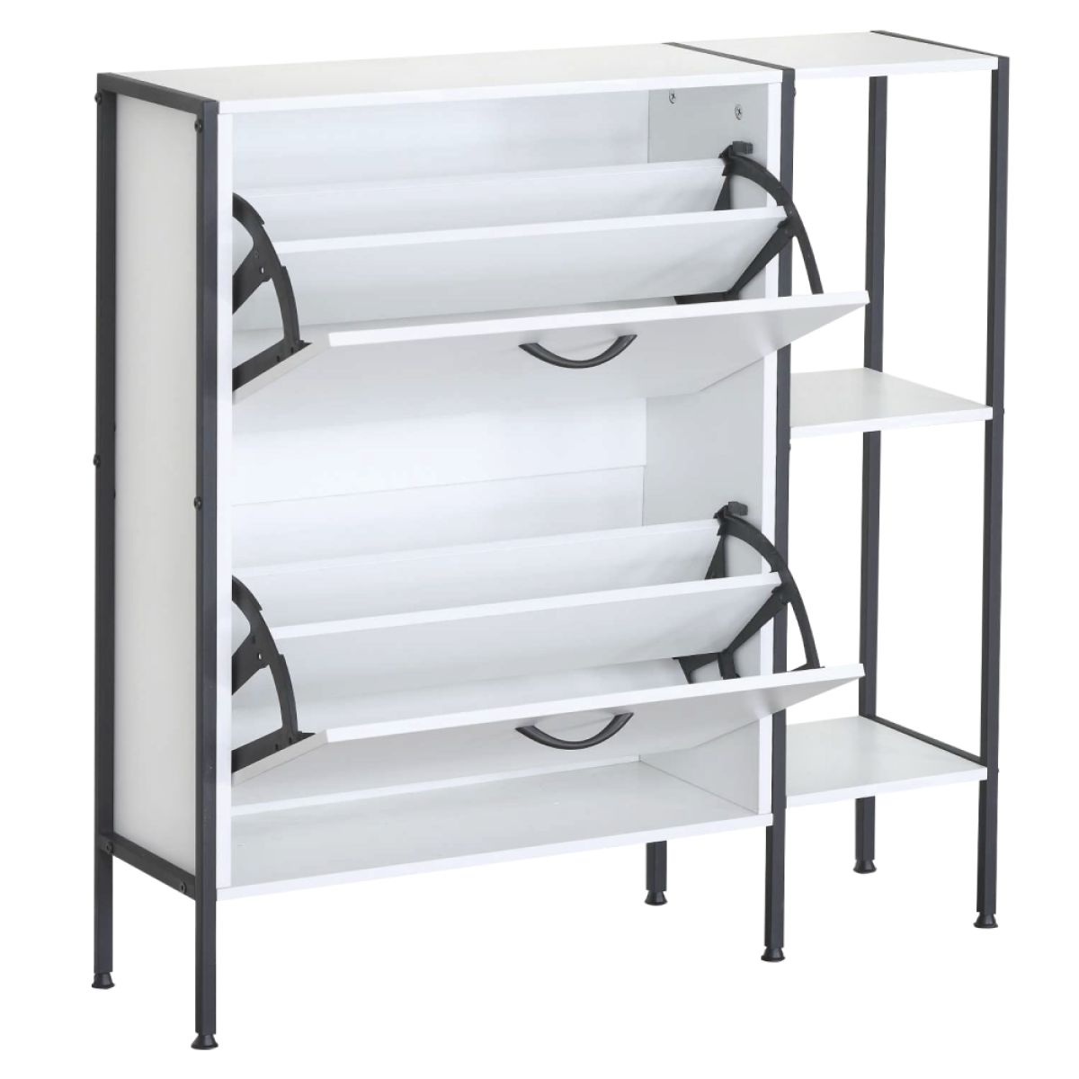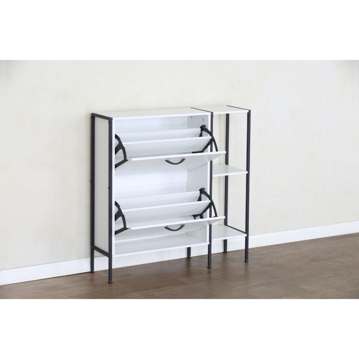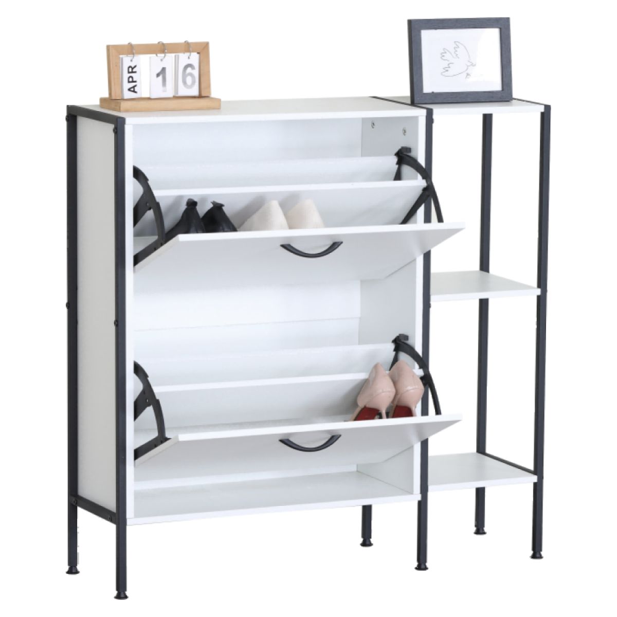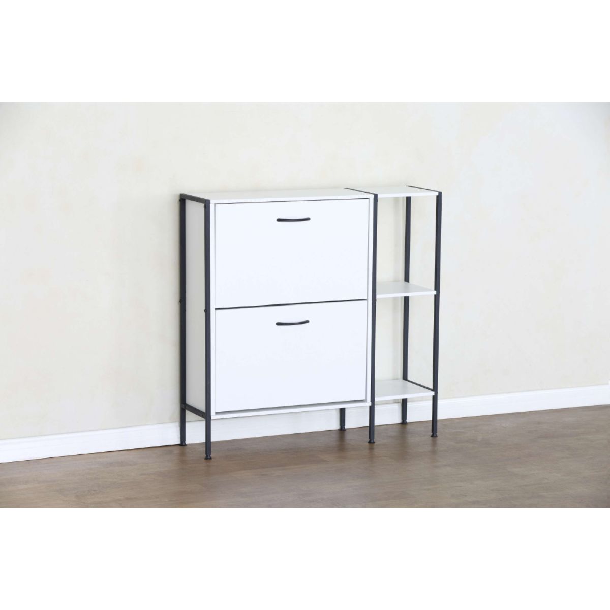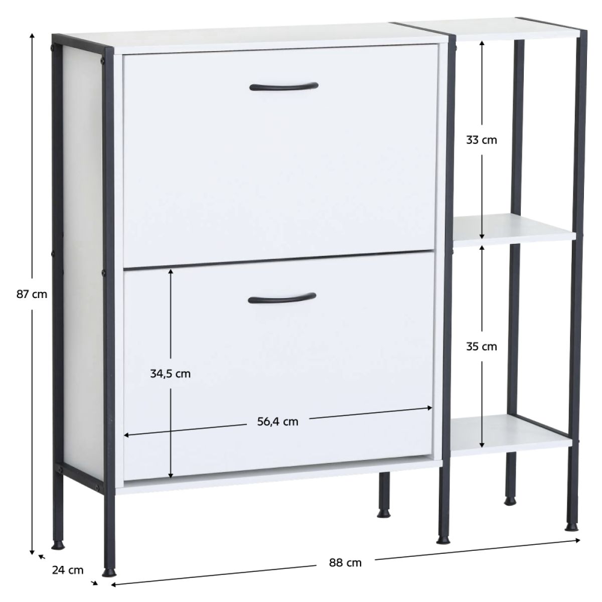 Material: PAL/oţel/plastic Culoare: alb/negru Dimensiuni (lxAxh): 88x24x87 cm Grosime material: 1,2-1,5 cm Pe picioare Două sertare rabatabile Sertar împărţit în 2 părţi Dimensiuni sertar basculabil (lxh): 56,4x34,5 cm Portanţa sertarului basculabil: 6 kg Poliţe Portanţa blatului superior: 10 kg Design modern Practic Livrat dezasamblat