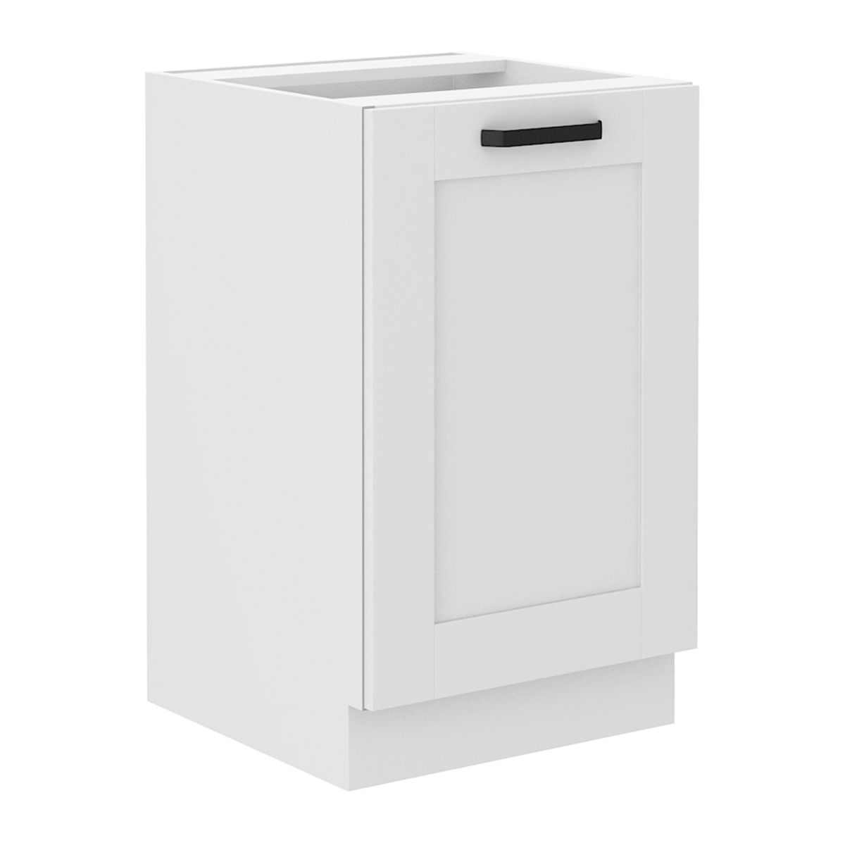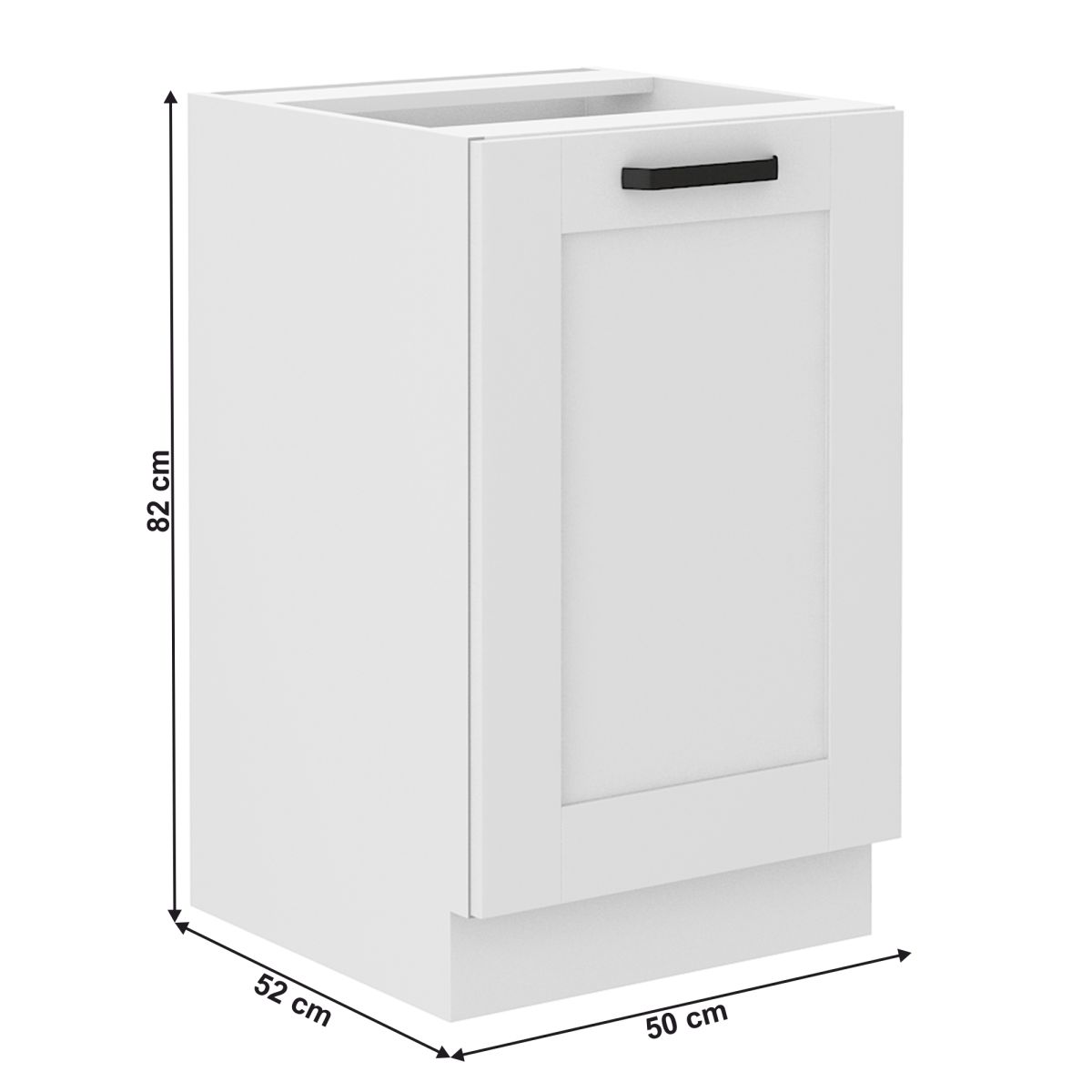 Dulap chiuvetă LULA 50 ZL 1F BB Material: HDF/MDF laminat Culoare: albă Dimensiuni (LxAxÎ): 50x52x82 cm Grosime material: 1,6 cm Grosime uşă: 2 cm Cu uşă, Cu mâner metalic Culoarea mânerului: neagră Cu şină inferioară/plintă, Fără blat, Furnizat fără chiuvetă, Design dinamic modern, Dulapurile inferioare sunt furnizate împreună cu şina inferioară, Fără blat de lucru. Opţiunea de a achiziţiona blat de lucru din stejar artisan sau marmură roma la preţul de 319/metru liniar. Opţiunea de a achiziţiona o chiuvetă universală LAY ON.