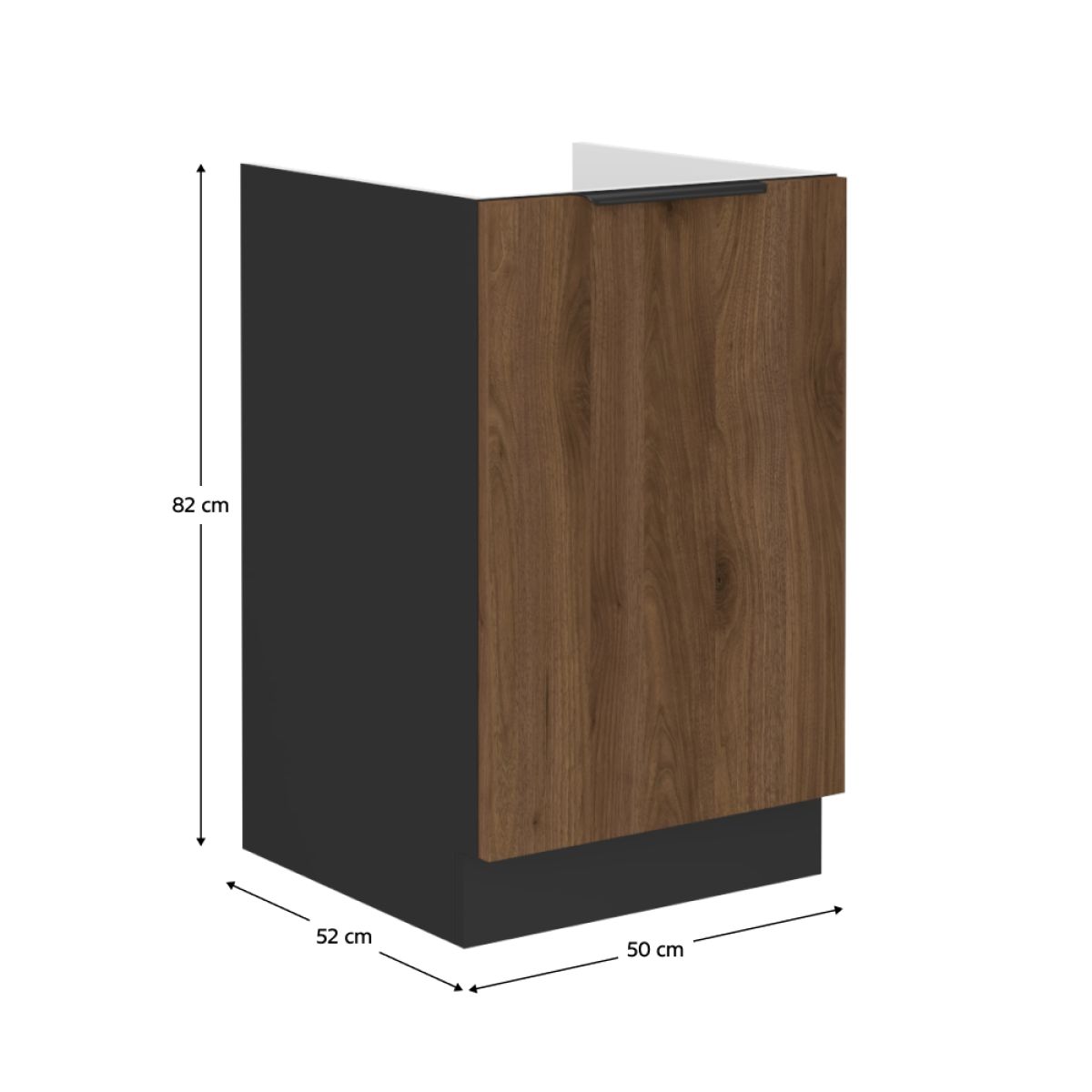 Material: DTD laminat Culoarea uşii: nuc okapi Culoarea dulapului: negru mat Dimensiuni (Lxlxh): 50x52x82 cm Grosime material: 1,6 cm Cu o uşă Cu mâner Culoarea mânerului: aluminiu Cu şină inferioară/plintă, Fără blat de lucru, Design modern un Sistem de închidere silenţioasă a uşilor Opţiunea de a achiziţiona o chiuvetă universală LAY ON Se livrează dezasamblat Dulapurile inferioare sunt furnizate împreună cu şina inferioară, fără blat de lucru. Opţiunea de a achiziţiona blat de lucru din marmură roma la preţul de 339,-/m. Opţiunea de a achiziţiona o chiuvetă universală LAY ON.