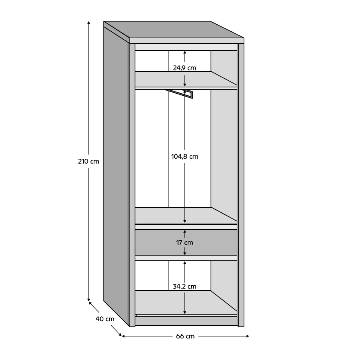 Material: DTD melaminat Culoare: stejar sonoma Dimensiuni (Lxlxh): 66x40x210 cm Grosime material: 3,2 cm Grosimea materialului celelalte părţi: 1,6 cm Sertar cu patru uşi Suport umeraş extensibil Sertar Înălţime sertar: 17 cm Dulap cu uşă dublă Înălţime dulap: 34,2 cm Vă recomandăm să ataşaţi mobilierul de perete Livrat dezasamblat