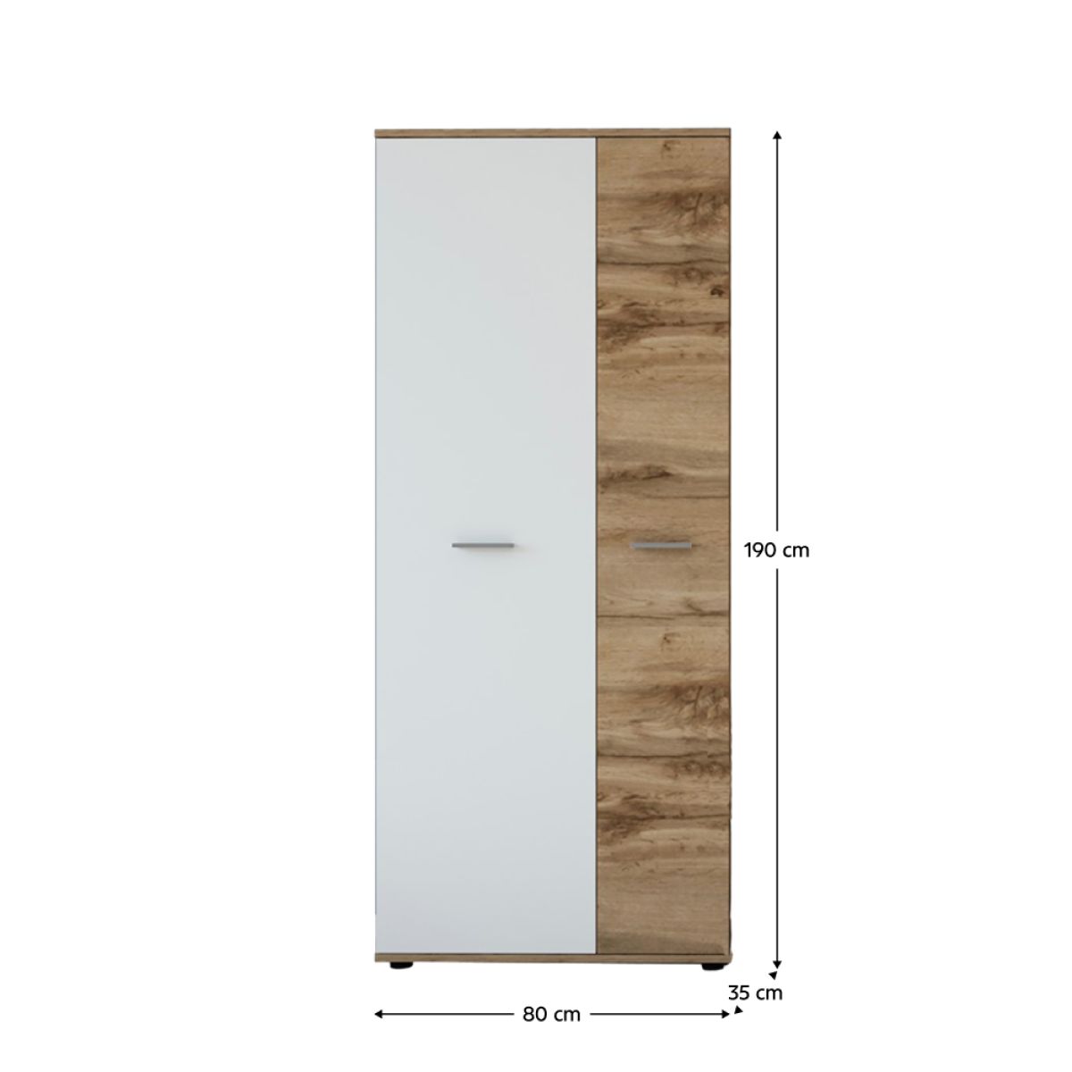 Material: PAL melaminat / muchii din ABS Culoare: stejar Wotan / albă Dimensiuni (LxAxÎ): 80x35x190 cm Grosime material: 1,6 cm Cu raft Cu 2 uşi Cu bară pentru umeraşe Mânere din plastic argintiu Capacitate de încărcare a plăcii superioare: 10 kg Capacitatea de încărcare a părţii pentru umeraşe: 3 kg Picioare din plastic Se recomandă fixarea pe perete Se livrează dezasamblat