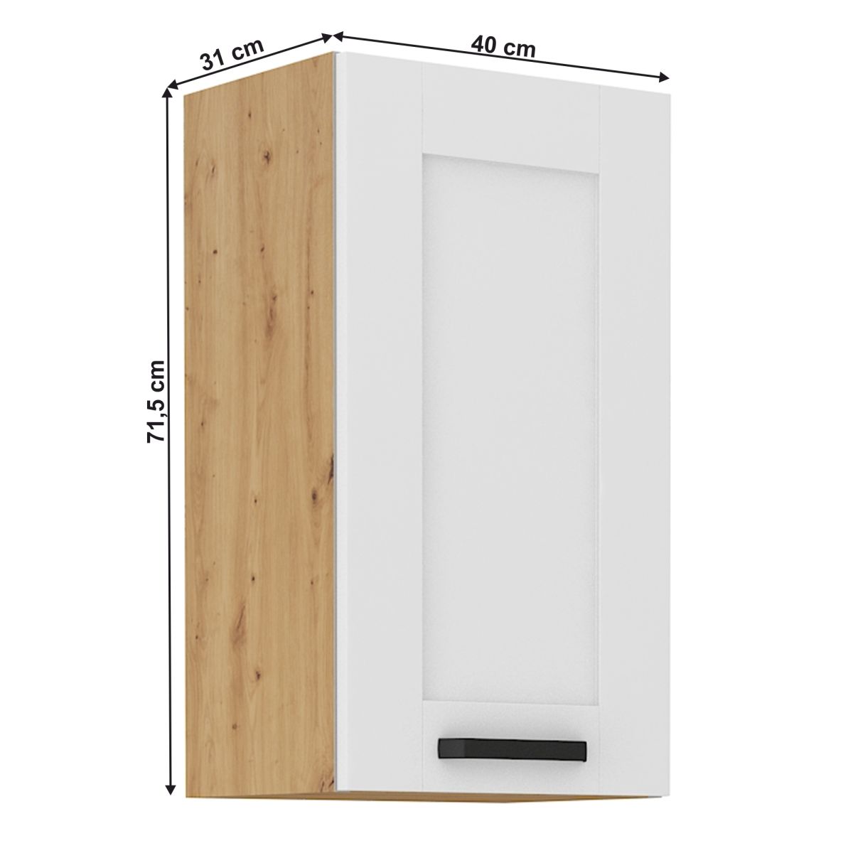 Dulap superior LULA 40 G-72 1F Material: laminat HDF/MDF Culoare: albă/stejar artisan Dimensiuni (LxAxÎ): 40x31x71,5 cm Grosime material: 1,6 cm Grosime uşă: 2 cm Cu raft, Cu mâner metalic, Culoarea mânerului: neagră, Design dinamic modern, Livrat dezasamblat, Opţiunea de a cumpăra o chiuvetă universală LAY ON, Dulapurile inferioare sunt furnizate împreună cu şina inferioară, Fără blat de lucru. Opţiunea de a achiziţiona blat de lucru din stejar artisan sau marmură roma la preţul de 319/metru liniar. Opţiunea de a achiziţiona o chiuvetă universală LAY ON.