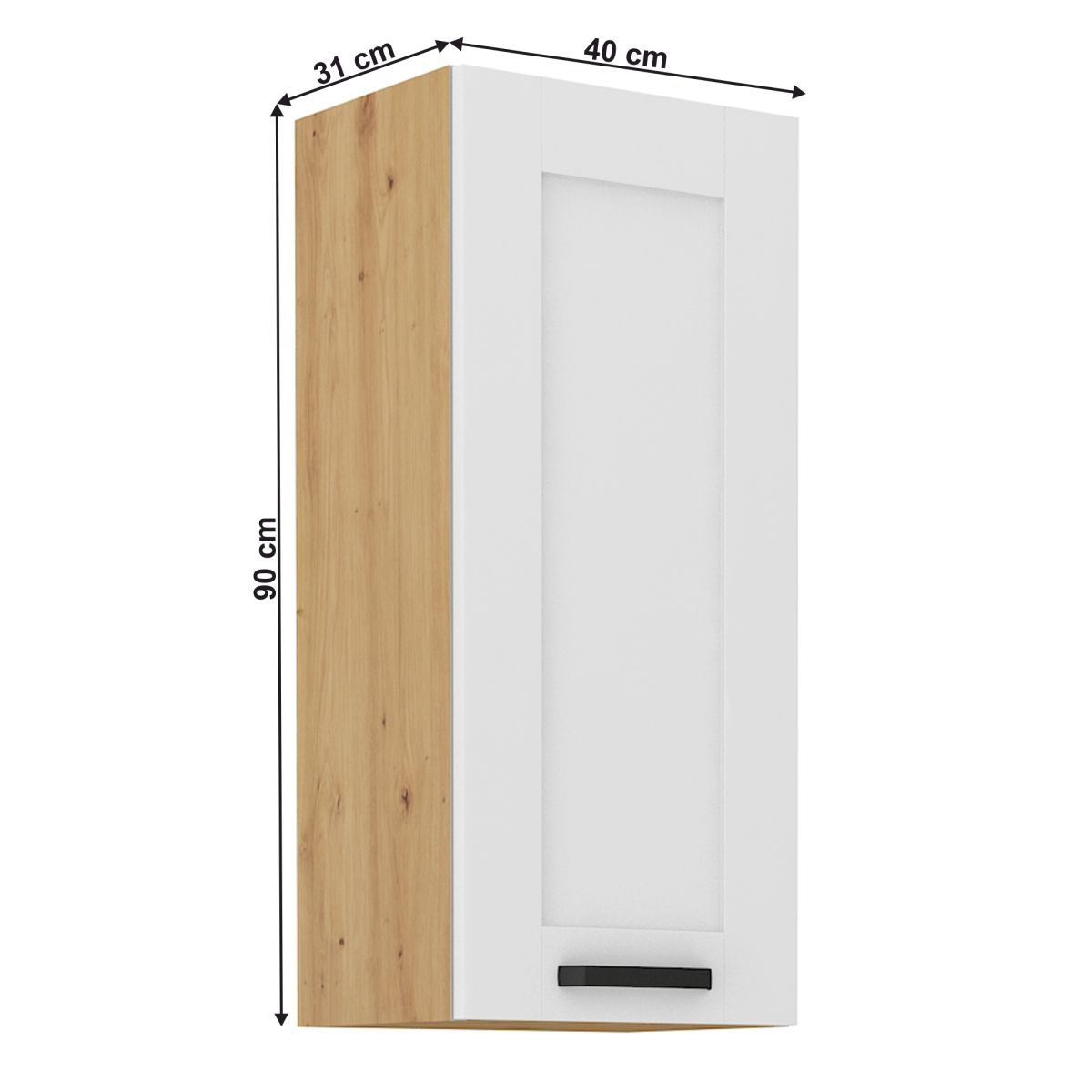 Dulap superior LULA 40 G-90 1F Material: laminat HDF/MDF Culoare: albă/stejar artisan Dimensiuni (LxAxÎ): 40x31x90 cm Grosime material: 1,6 cm Grosime uşă: 2 cm Cu raft, Cu mâner metalic, Culoarea mânerului: neagră, Design dinamic modern, Livrat dezasamblat, Opţiunea de a cumpăra o chiuvetă universală LAY ON, Dulapurile inferioare sunt furnizate împreună cu şina inferioară, Fără blat de lucru. Opţiunea de a achiziţiona blat de lucru din stejar artisan sau marmură roma la preţul de 319/metru liniar. Opţiunea de a achiziţiona o chiuvetă universală LAY ON.