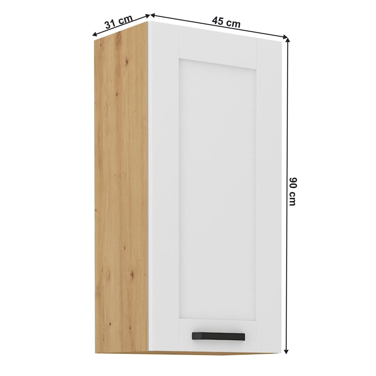 Dulap superior LULA 45 G-90 1F Material: laminat HDF/MDF Culoare: albă/stejar artisan Dimensiuni (LxAxÎ): 45x31x90 cm Grosime material: 1,6 cm Grosime uşă: 2 cm Cu raft, Cu mâner metalic, Culoarea mânerului: neagră, Design dinamic modern, Livrat dezasamblat, Opţiunea de a cumpăra o chiuvetă universală LAY ON, Dulapurile inferioare sunt furnizate împreună cu şina inferioară, Fără blat de lucru. Opţiunea de a achiziţiona blat de lucru din stejar artisan sau marmură roma la preţul de 319/metru liniar. Opţiunea de a achiziţiona o chiuvetă universală LAY ON.