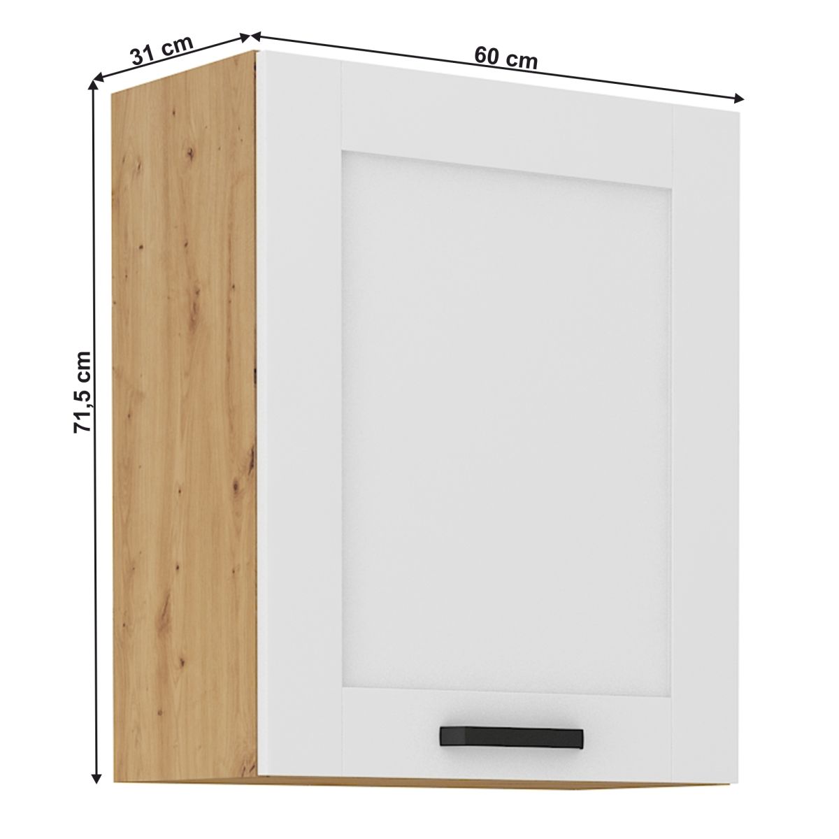 Dulap superior LULA 60 G-72 1F Material: laminat HDF/MDF Culoare: albă/stejar artisan Dimensiuni (LxAxÎ): 60x31x71,5 cm Grosime material: 1,6 cm Grosime uşă: 2 cm Cu raft, Cu mâner metalic, Culoarea mânerului: neagră, Design dinamic modern, Livrat dezasamblat, Opţiunea de a cumpăra o chiuvetă universală LAY ON, Dulapurile inferioare sunt furnizate împreună cu şina inferioară, Fără blat de lucru. Opţiunea de a achiziţiona blat de lucru din stejar artisan sau marmură roma la preţul de 319/metru liniar. Opţiunea de a achiziţiona o chiuvetă universală LAY ON.