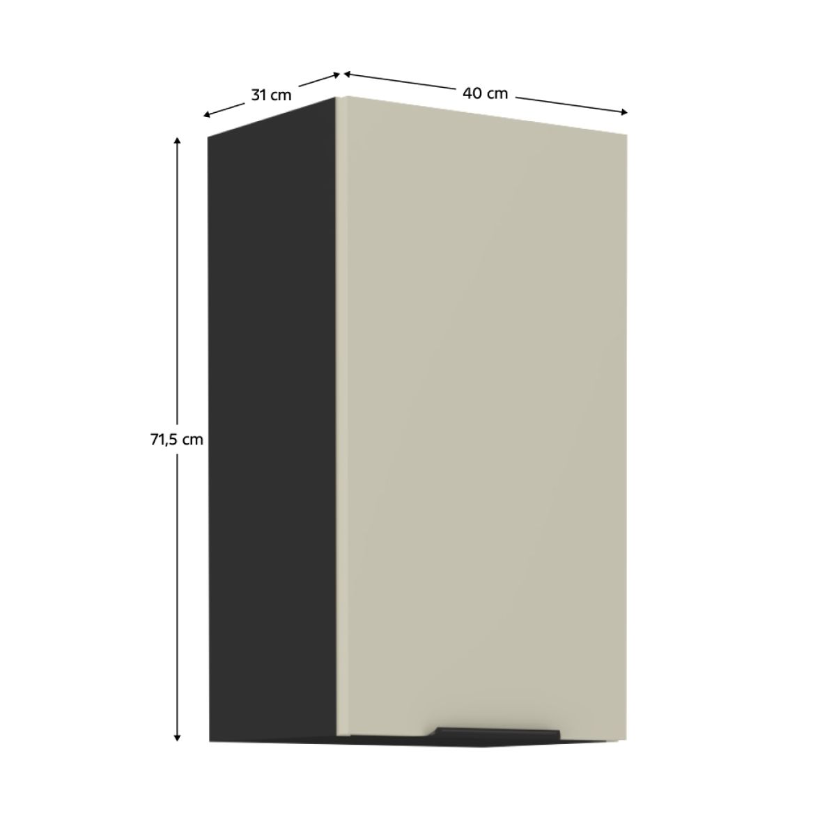 Material: DTD laminat Culoarea uşii: caşmir Culoarea dulapului: negru mat Dimensiuni (Lxlxh): 40x31x71,5 cm Grosime material: 1,6 cm Cu poliţă, Cu uşă, Cu mâner metalic, Culoarea mânerului: aluminiu, Design modern, Cu sistem de închidere silenţioasă a uşii, Livrat dezasamblat, Dulapurile inferioare sunt furnizate împreună cu şina inferioară, fără blat de lucru. Opţiunea de a achiziţiona blat de lucru din marmură roma la preţul de 339 Lei/ml. Opţiunea de a achiziţiona o chiuvetă universală LAY ON.