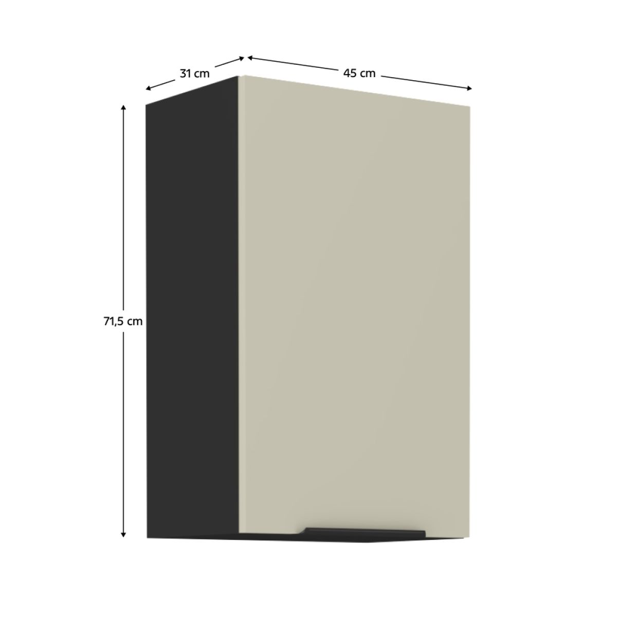Material: DTD laminat Culoarea uşii: caşmir Culoarea dulapului: negru mat Dimensiuni (Lxlxh): 45x31x71,5 cm Grosime material: 1,6 cm Cu uşă, Cu o uşă, Design modern, Cu sistem de închidere silenţioasă a uşii, Cu mâner metalic, Culoarea mânerului: aluminiu, Livrat dezasamblat, Dulapurile inferioare sunt furnizate împreună cu şina inferioară, fără blat de lucru. Opţiunea de a achiziţiona blat de lucru din marmură roma la preţul de 339 Lei/ml. Opţiunea de a achiziţiona o chiuvetă universală LAY ON.