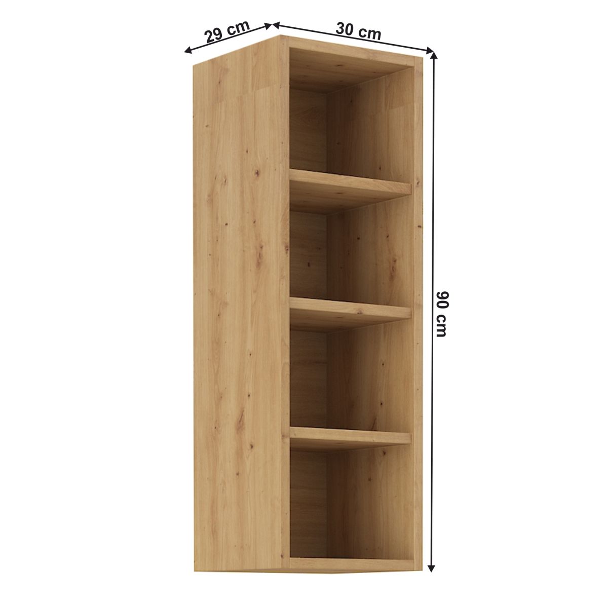 Dulap superior cu rafturi LULA 30 G-90 OTW Material: laminat HDF Culoare: stejar artisan Dimensiuni (LxAxÎ): 30x29x90cm Grosime material: 1,6 cm Cu rafturi, Fără uşă, Design dinamic modern, Livrat dezasamblat, Opţiunea de a cumpăra o chiuvetă universală LAY ON, Dulapurile inferioare sunt furnizate împreună cu şina inferioară, Fără blat de lucru. Opţiunea de a achiziţiona blat de lucru din stejar artisan sau marmură roma la preţul de 319/metru liniar. Opţiunea de a achiziţiona o chiuvetă universală LAY ON.