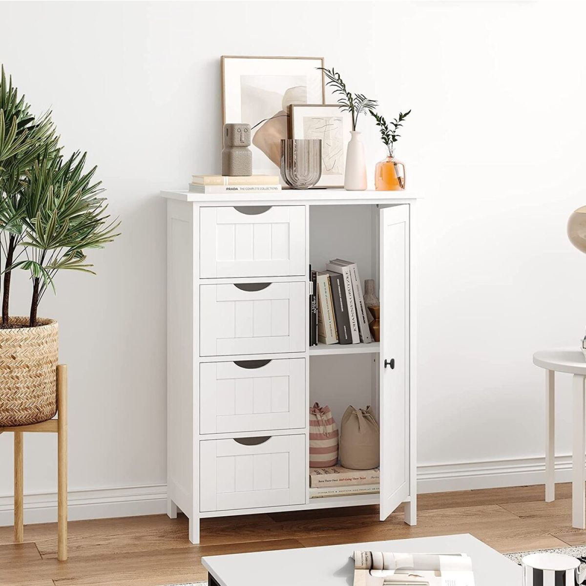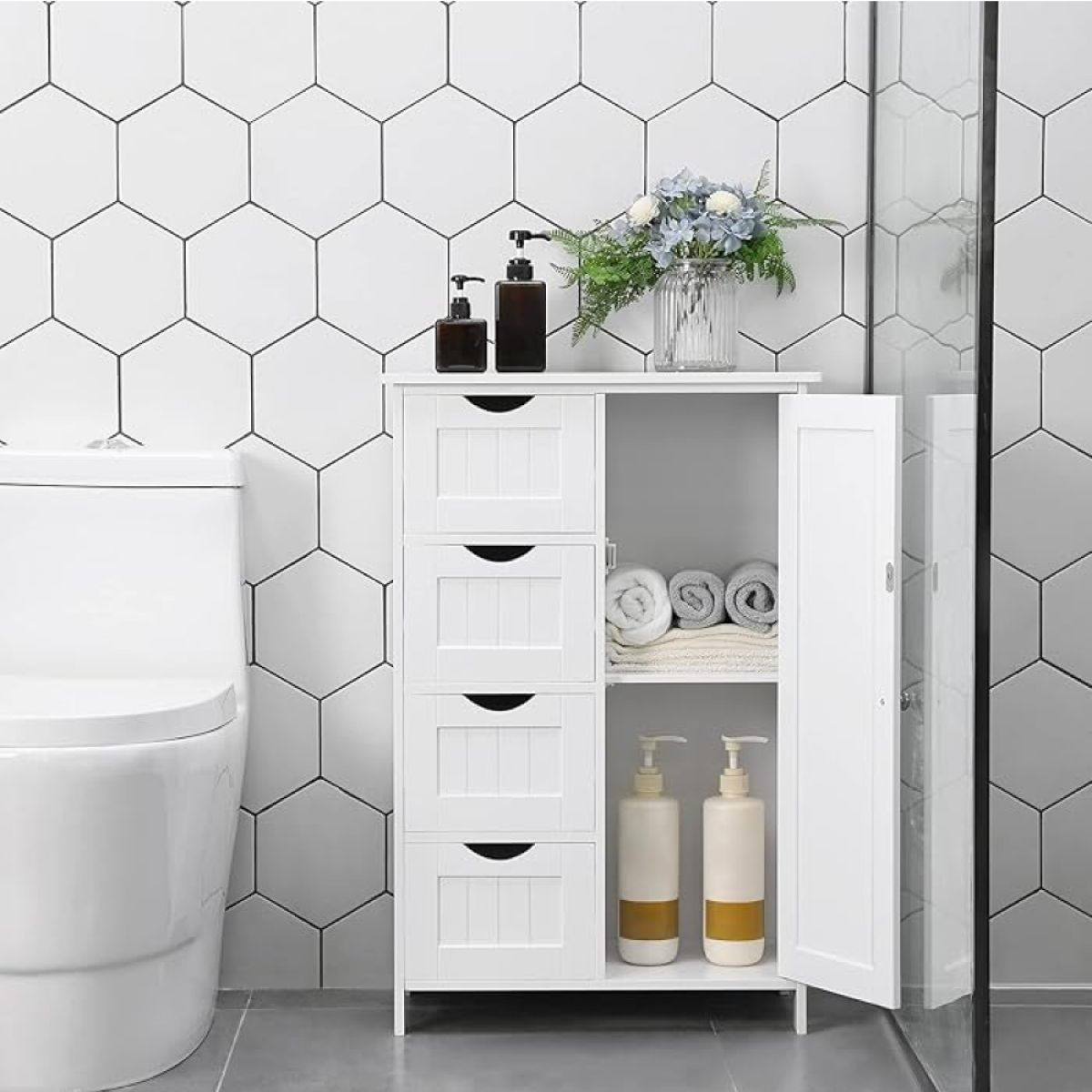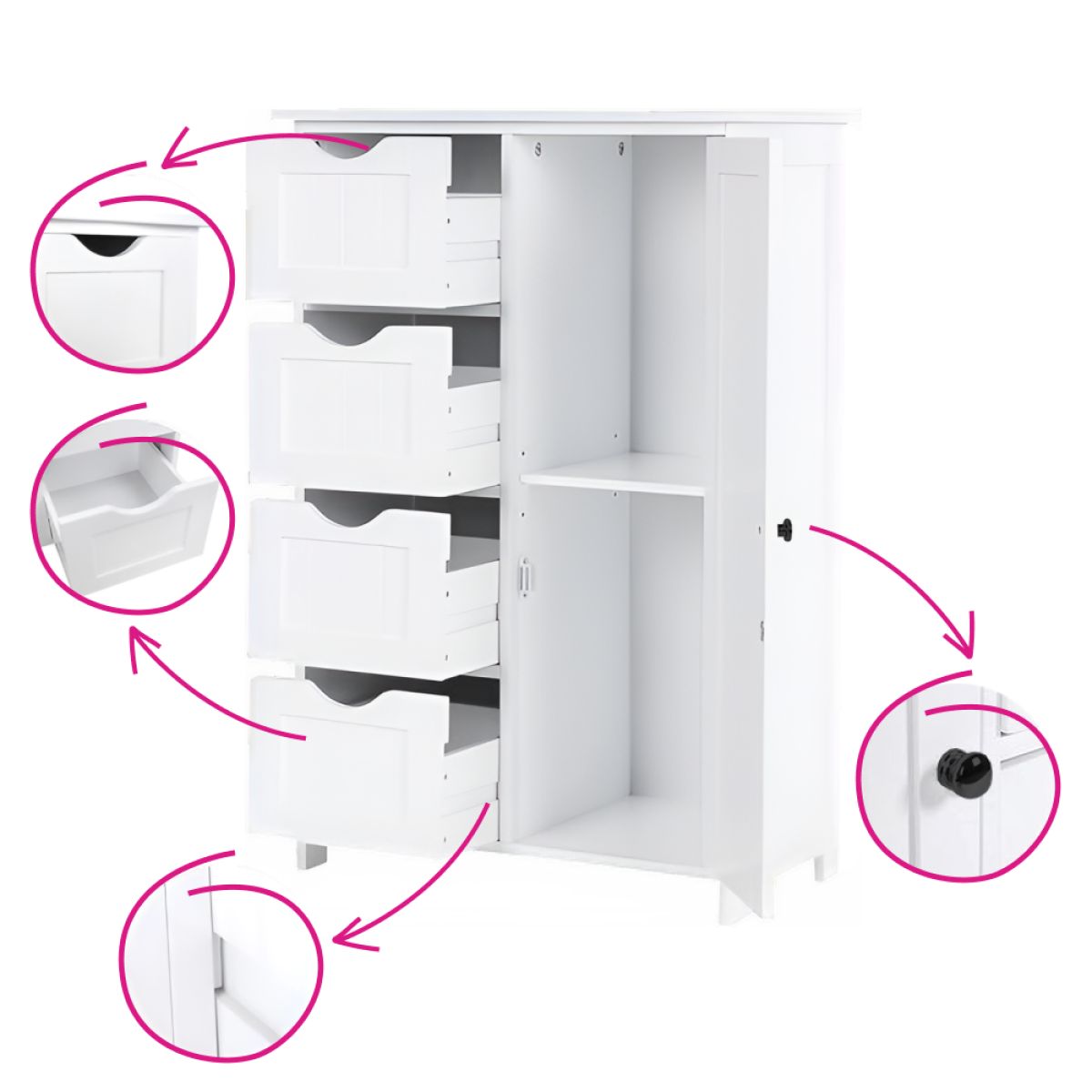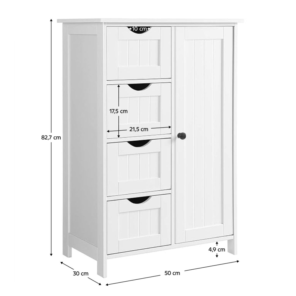 Material: MDF Culoare: albă Dimensiuni (lxAxh): 50x30x82,7 cm Grosimea materialului MDF: 1,2 cm Dulăpior Raft Comodă Cu o uşă Un dulăpior Poliţă Lăţime poliţă: 21,5 cm Înălţimea dintre poliţe: 37,1 cm Patru sertare Dimensiuni sertar (lxh): 21,5x17,5 cm Pe picioare Înălţimea compartimentului inferior de la podea: 4,9 cm Cu mânere Material mânere: zinc Culoare mânere: neagră Practic Portanţa plăcii de sus: 20 kg Portanţa poliţei: 10 kg Portanţa sertarului: 3 kg Recomandăm fixarea mobilierul de perete Livrat dezasamblat