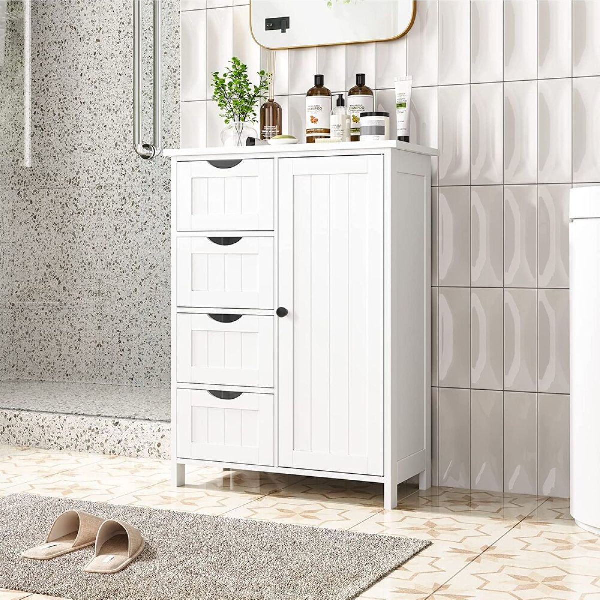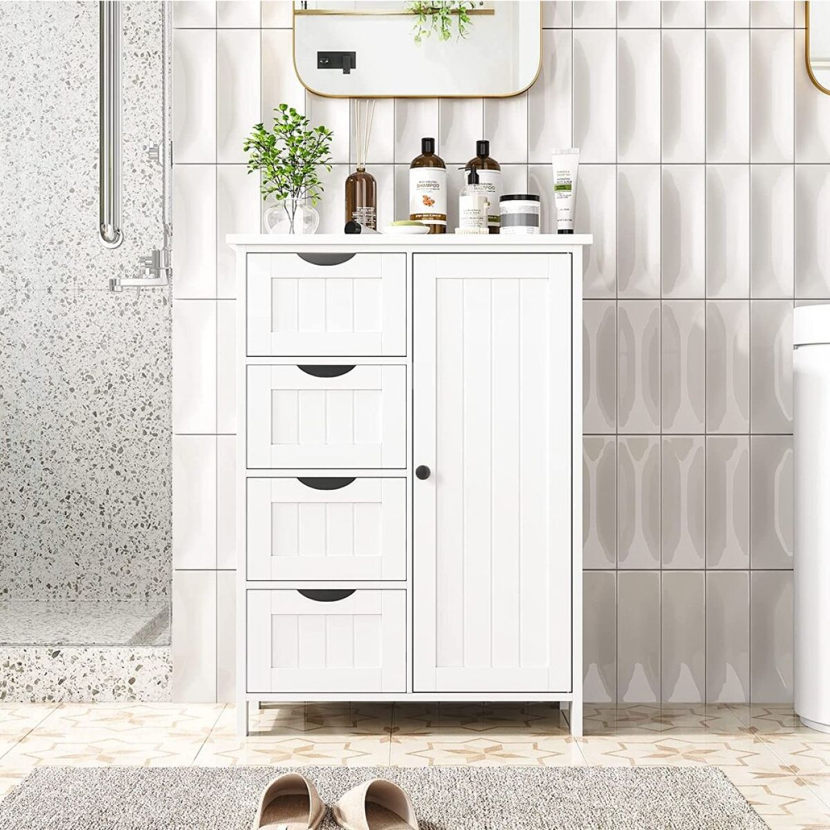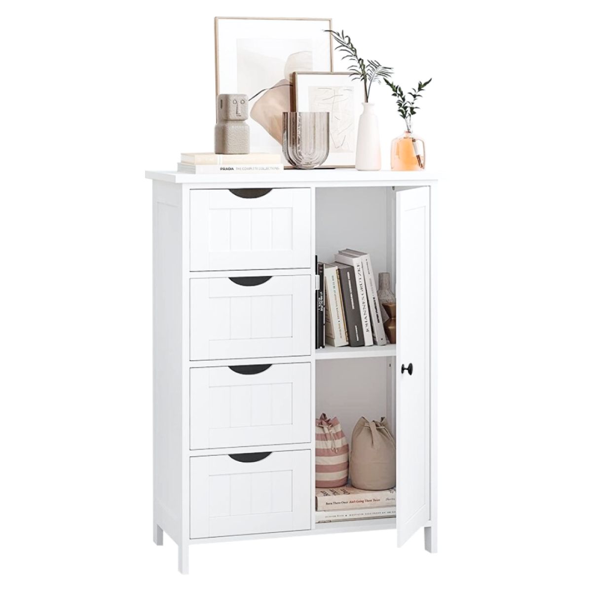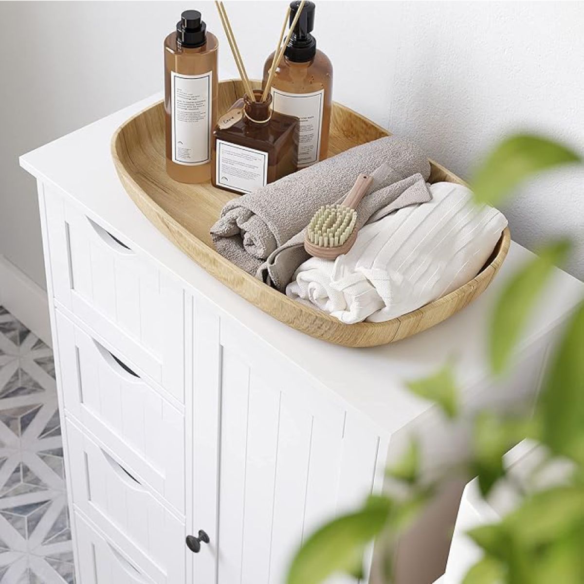 Material: MDF Culoare: albă Dimensiuni (lxAxh): 50x30x82,7 cm Grosimea materialului MDF: 1,2 cm Dulăpior Raft Comodă Cu o uşă Un dulăpior Poliţă Lăţime poliţă: 21,5 cm Înălţimea dintre poliţe: 37,1 cm Patru sertare Dimensiuni sertar (lxh): 21,5x17,5 cm Pe picioare Înălţimea compartimentului inferior de la podea: 4,9 cm Cu mânere Material mânere: zinc Culoare mânere: neagră Practic Portanţa plăcii de sus: 20 kg Portanţa poliţei: 10 kg Portanţa sertarului: 3 kg Recomandăm fixarea mobilierul de perete Livrat dezasamblat