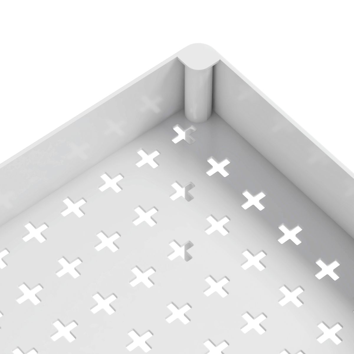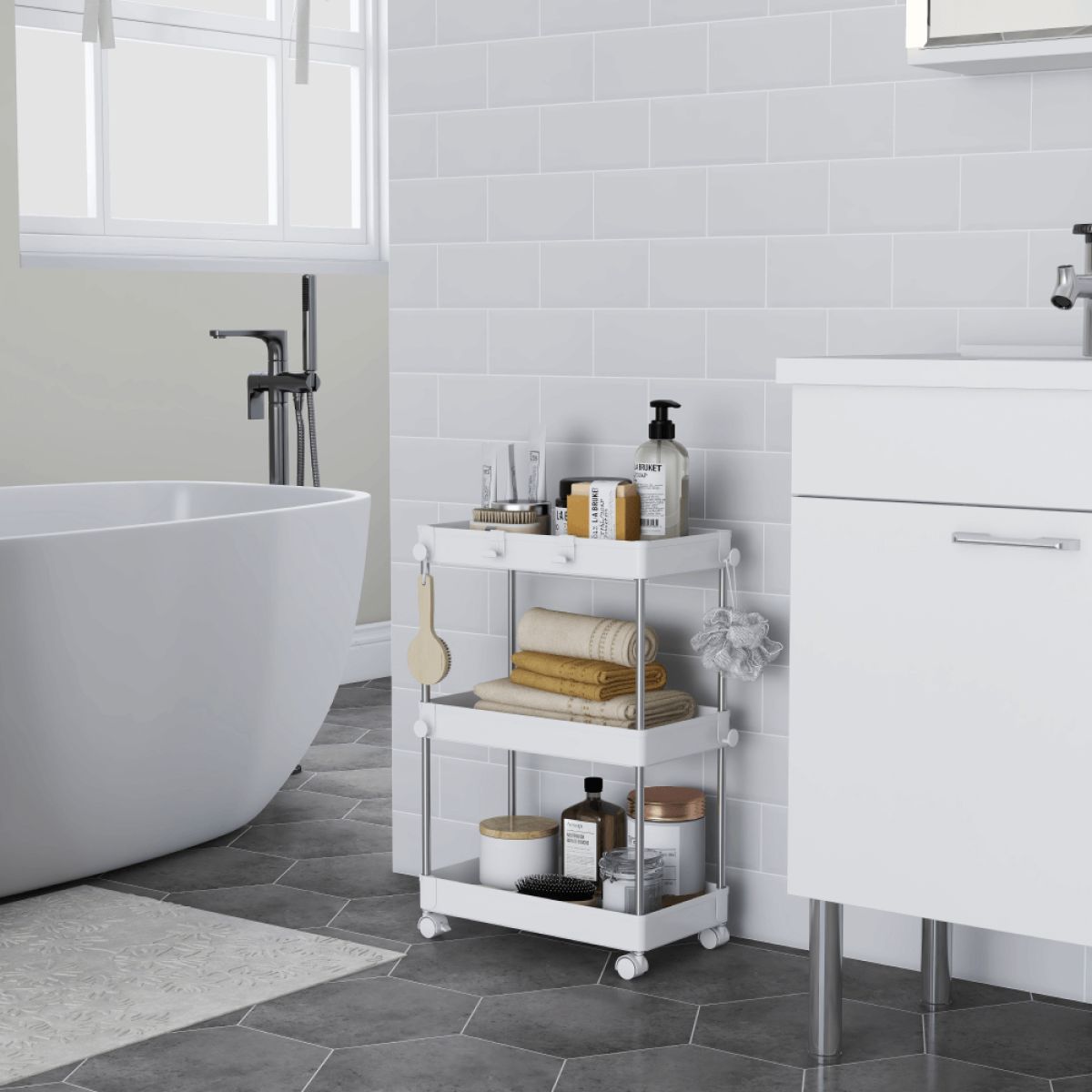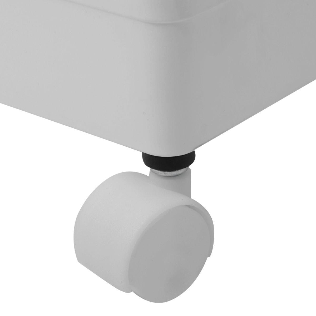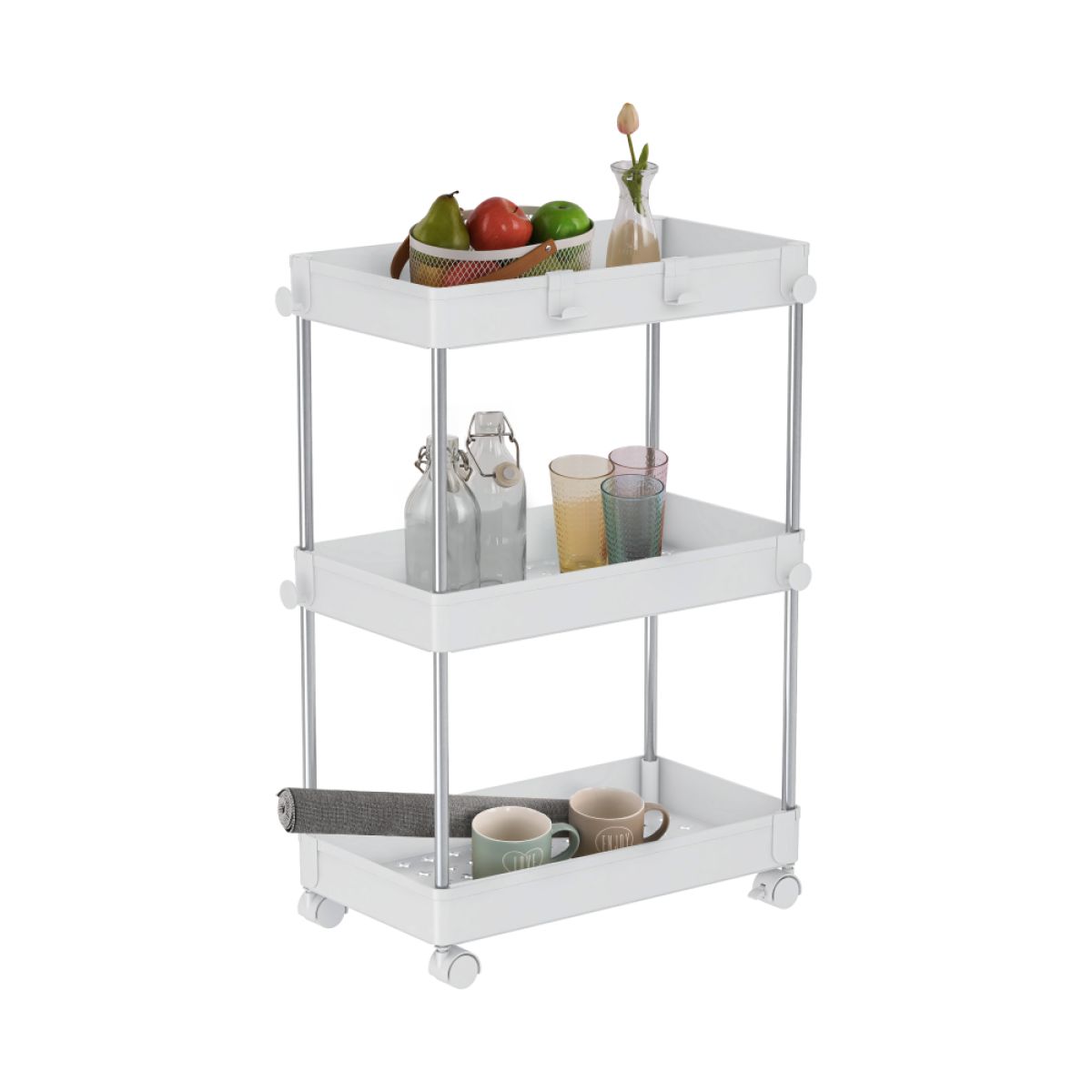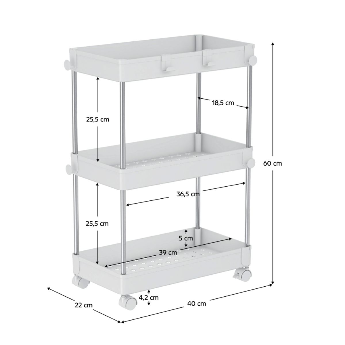 Material: plastic / oţel inoxidabil Culoare: albă Dimensiuni (LxAxÎ): 40x22x60 cm Trei rafturi din plastic Înălţime raft: 5 cm Înălţimea dintre rafturi: 25,5 cm Capacitatea de încărcare a raftului: 3 kg Prevăzută cu perforaţii pentru circulaţia aerului Cu cârlige Mobilă Cu roţi Roţi pivotante Înălţimea roţii: 4,2 cm Patru roţi Două roţi cu frâne Cadru din oţel inoxidabil Design modern Livrată dezasamblată