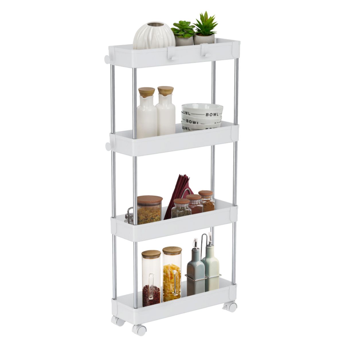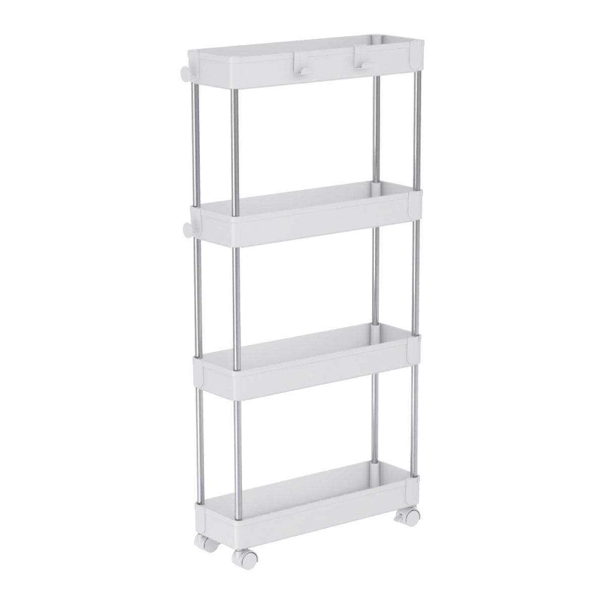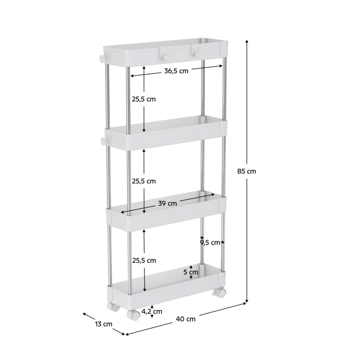 Material: plastic / oţel inoxidabil Culoare: albă Dimensiuni (LxAxÎ): 40x13x85 cm Patru rafturi din plastic Înălţime raft: 5 cm Înălţimea dintre rafturi: 25,5 cm Capacitatea de încărcare a raftului: 3 kg Prevăzută cu perforaţii pentru circulaţia aerului Cu cârlige Mobilă Cu roţi Roţi pivotante Înălţimea roţii: 4,2 cm Patru roţi Două roţi cu frâne Cadru din oţel inoxidabil Design modern Livrată dezasamblată