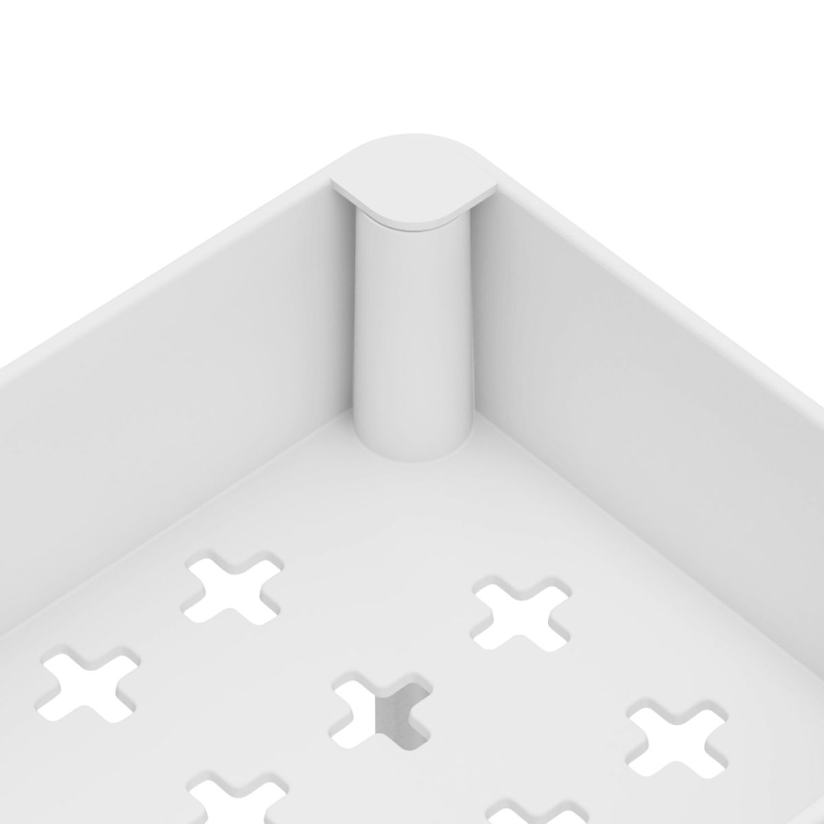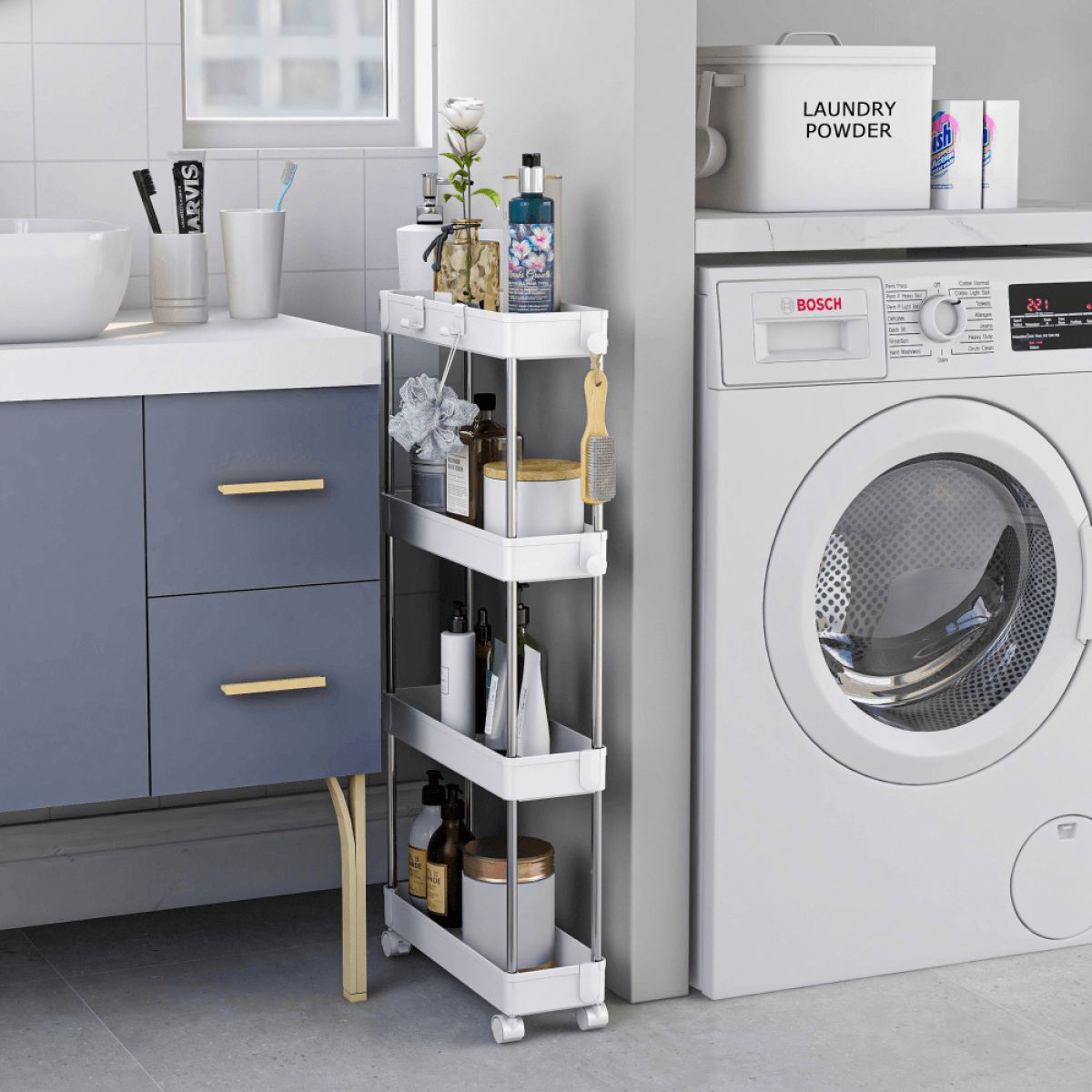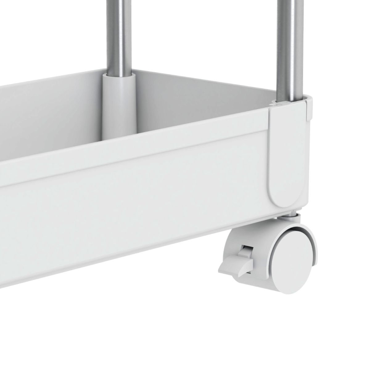 Material: plastic / oţel inoxidabil Culoare: albă Dimensiuni (LxAxÎ): 40x13x85 cm Patru rafturi din plastic Înălţime raft: 5 cm Înălţimea dintre rafturi: 25,5 cm Capacitatea de încărcare a raftului: 3 kg Prevăzută cu perforaţii pentru circulaţia aerului Cu cârlige Mobilă Cu roţi Roţi pivotante Înălţimea roţii: 4,2 cm Patru roţi Două roţi cu frâne Cadru din oţel inoxidabil Design modern Livrată dezasamblată